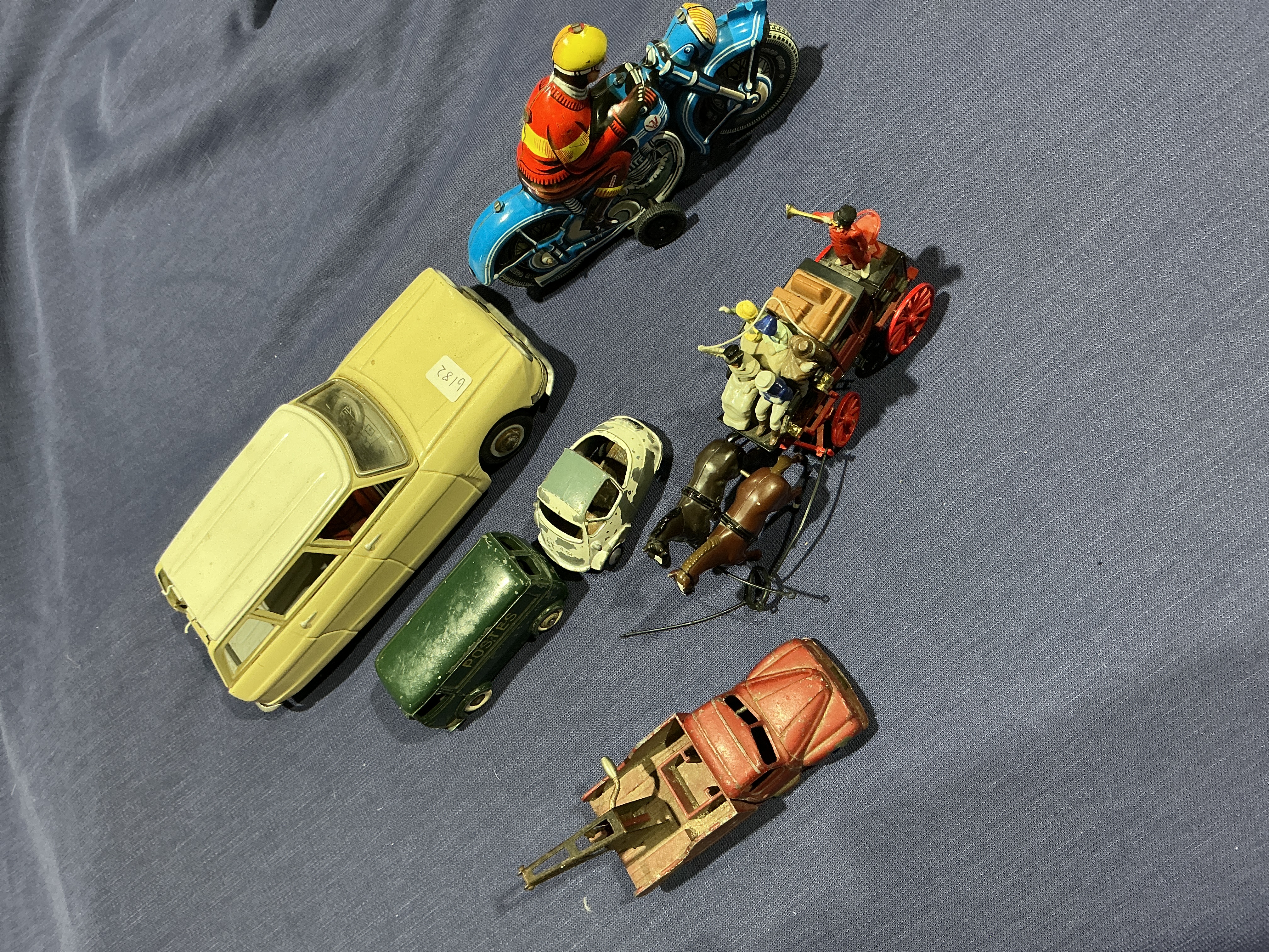 Paint condition varies across the lot; the tinplate Citroën is in good condition with minor scuffing, while the die-cast Dinky models exhibit significant paint chipping and surface wear, particularly the Vespa 400. The clockwork motorcycle retains bright lithography but lacks a key and the mechanism is untested. The stagecoach shows moderate play wear with partially detached harnessing and one loose horse. The breakdown truck is missing the original crane string and hook. No boxes are present.