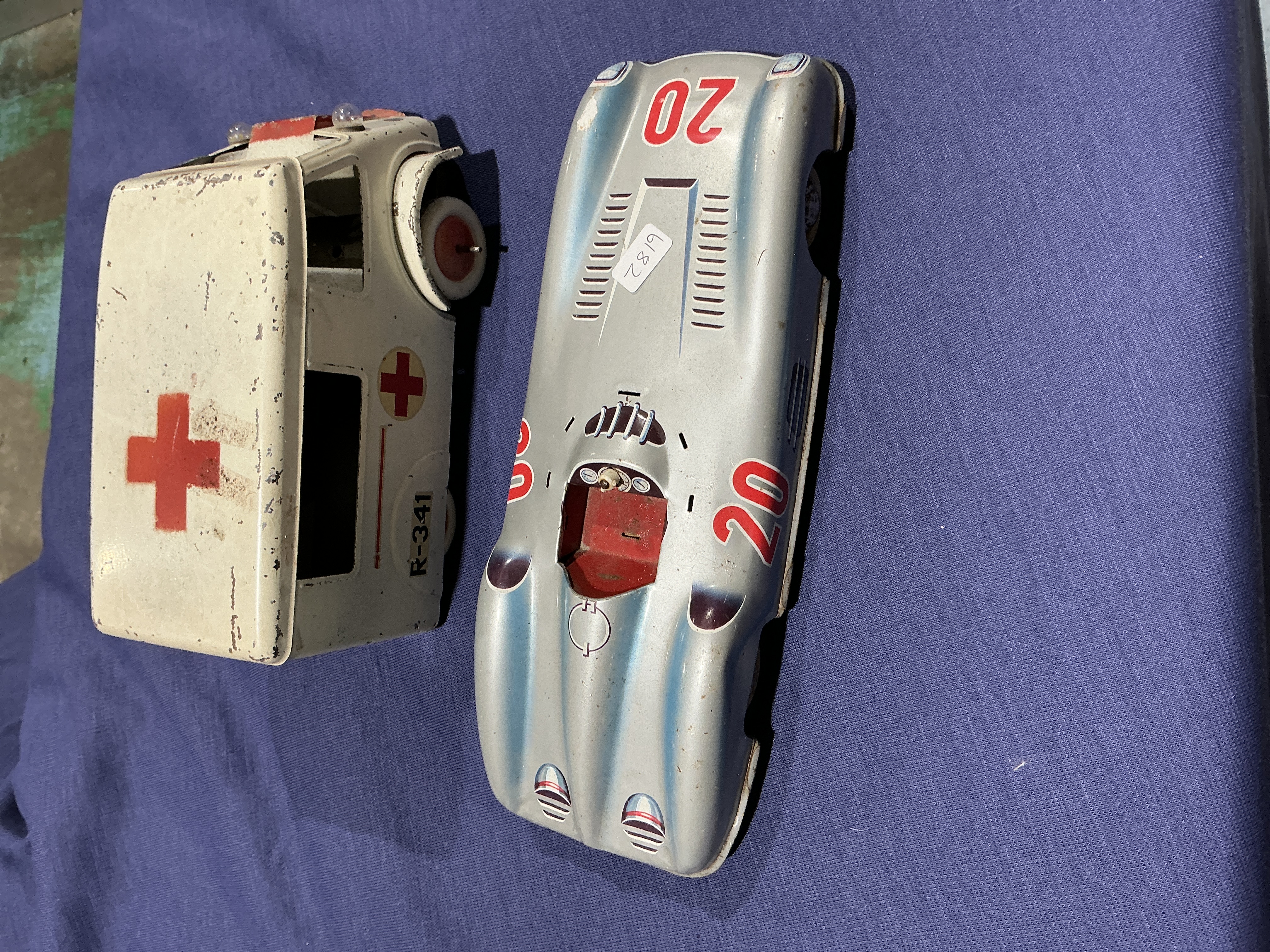 Both toys are in fair condition. The Marx ambulance shows significant paint loss, scratches, and surface oxidation to the roof and underside; it is missing the rear door and the mechanism is untested. The racing car exhibits heavy scuffing and scratches to the paintwork with oxidation on the underside; it is incomplete, missing the driver figure and one wheel. The friction mechanism is untested.
