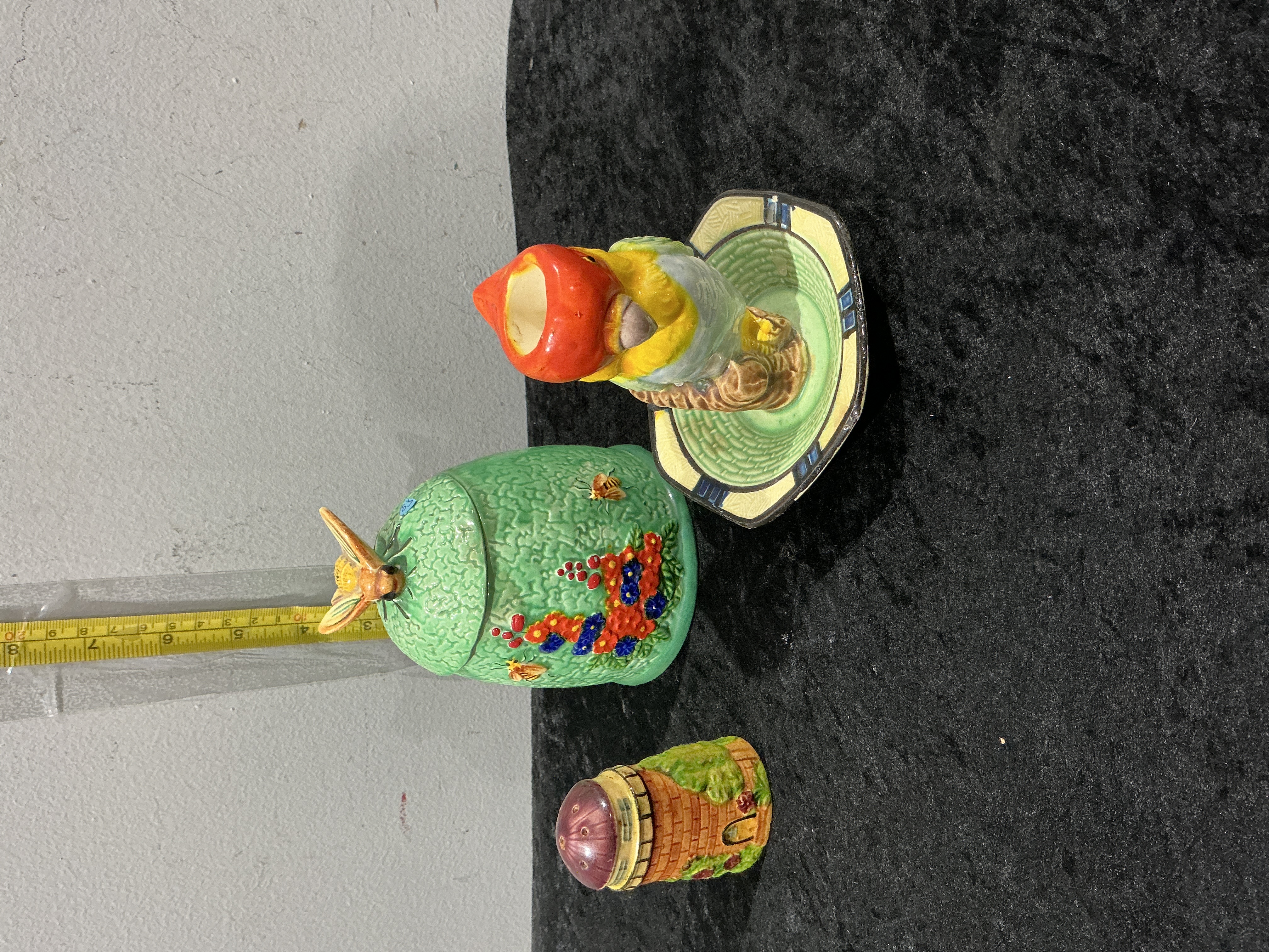 A charming group of three vintage Japanese export ceramic items, characteristic of the “cottage ware” style produced for the international market. The collection includes a beehive-form lidded honey jar featuring a relief-moulded bee finial and floral sprays; a small decorative dish with an attached polychrome bird figurine; and a shaker modelled in the form of a masonry tower with climbing vine accents. Each piece is executed in slip-cast ceramic with vibrant hand-painted polychrome glazes and relief-moulded details. The bases of the honey jar and the bird dish bear the Marutomoware circular “T” mark, “Made in Japan”, and Japanese patent numbers (including Pat. No. 85335). Honey jar height: approx. 11 cm. Bird dish diameter: approx. 10 cm. Shaker height: approx. 6 cm.