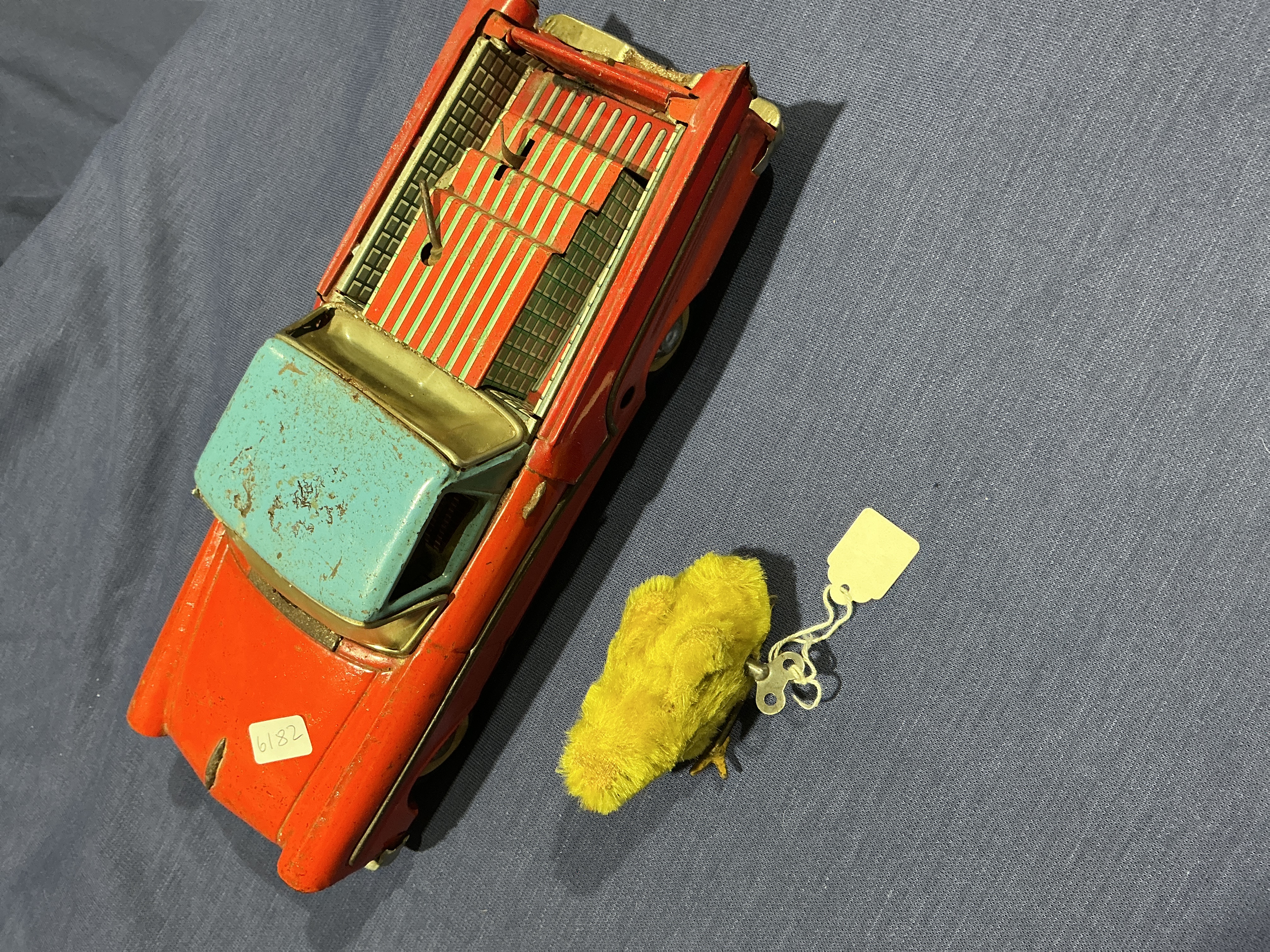 This lot comprises two vintage toys. The first is a Japanese tinplate lithograph Rollover car, styled after a 1957 Ford Ranchero, likely manufactured by Bandai or a contemporary Japanese firm. It features a red body with a teal roof and a mechanical flipping bar to the rear. The second item is a novelty wind-up hopping chick, constructed with yellow plush fabric over a metal frame with stamped metal feet. Both items are without their original boxes. The car operates via a friction or clockwork mechanism, while the chick includes a separate winding key for its clockwork movement. Circa late 1950s to early 1960s.