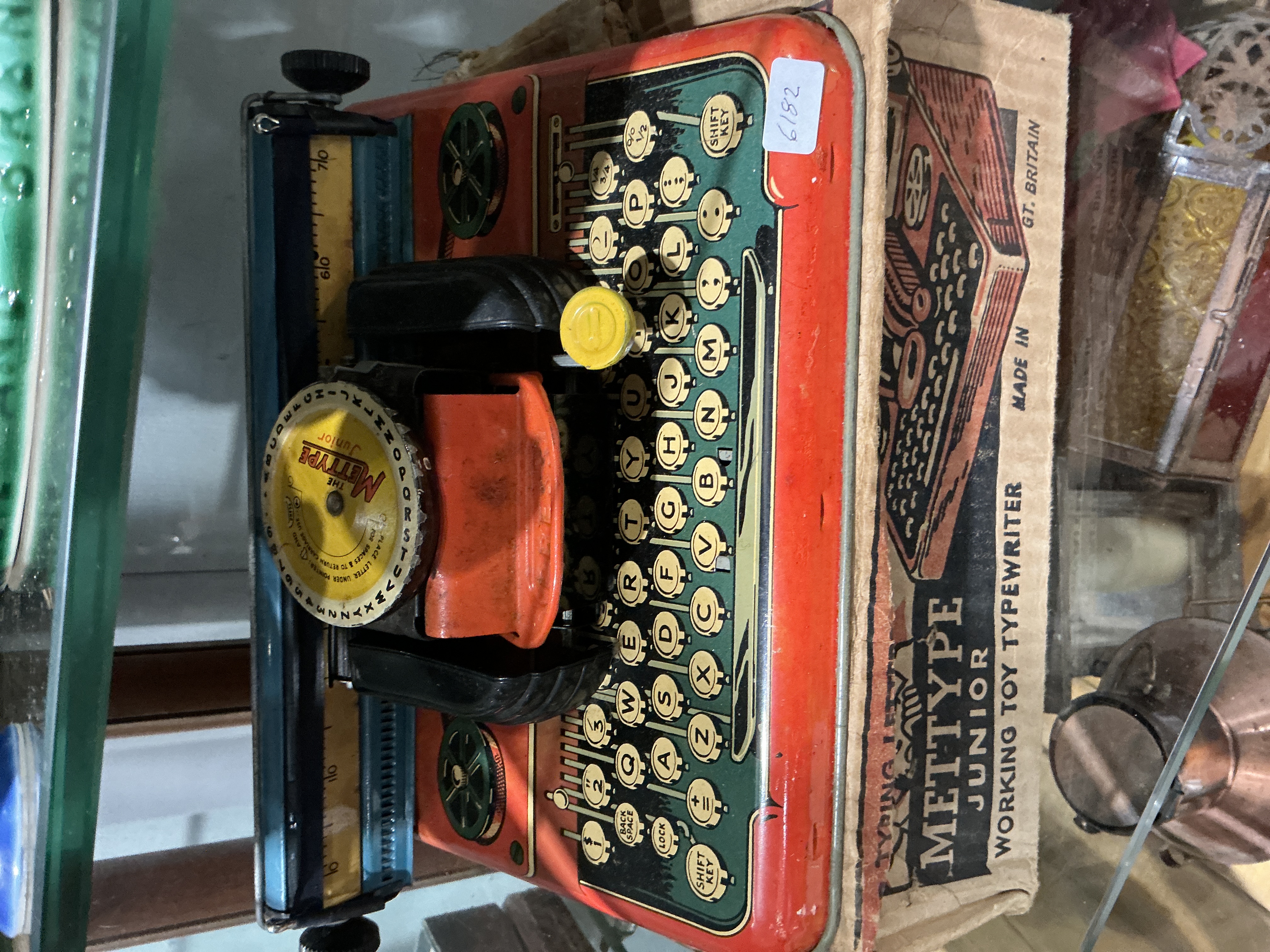 A vintage Mettype Junior working toy typewriter manufactured by Mettoy in Great Britain, circa 1955. This index-style toy is constructed primarily from lithographed tin-plate with a vibrant red and green colour scheme. It features a manual operation where characters are selected via a rotating yellow index dial and printed by pressing down. The unit includes a manual moving carriage with a paper scale and plastic control knobs. This lot is complete with its original illustrated cardboard shipping box.