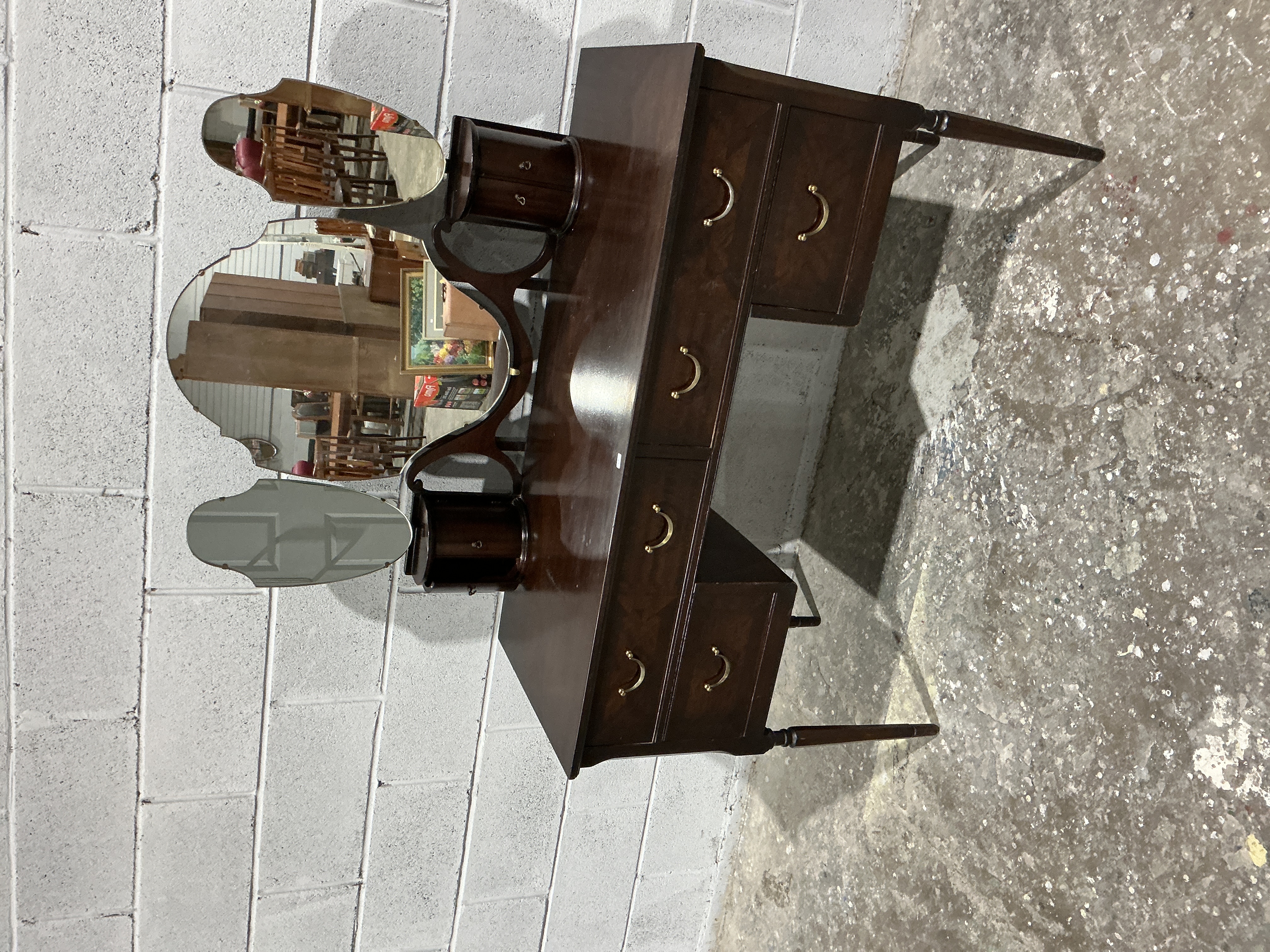 The piece is in good vintage condition with a well-preserved polished finish. Minor surface scuffs and light scratches are visible on the tabletop and drawer fronts, consistent with age and use. The mirrors are intact but show minor signs of age-related foxing and silvering degradation, particularly on the side panels. The brass-toned handles and leg ferrules appear to be original and complete.
