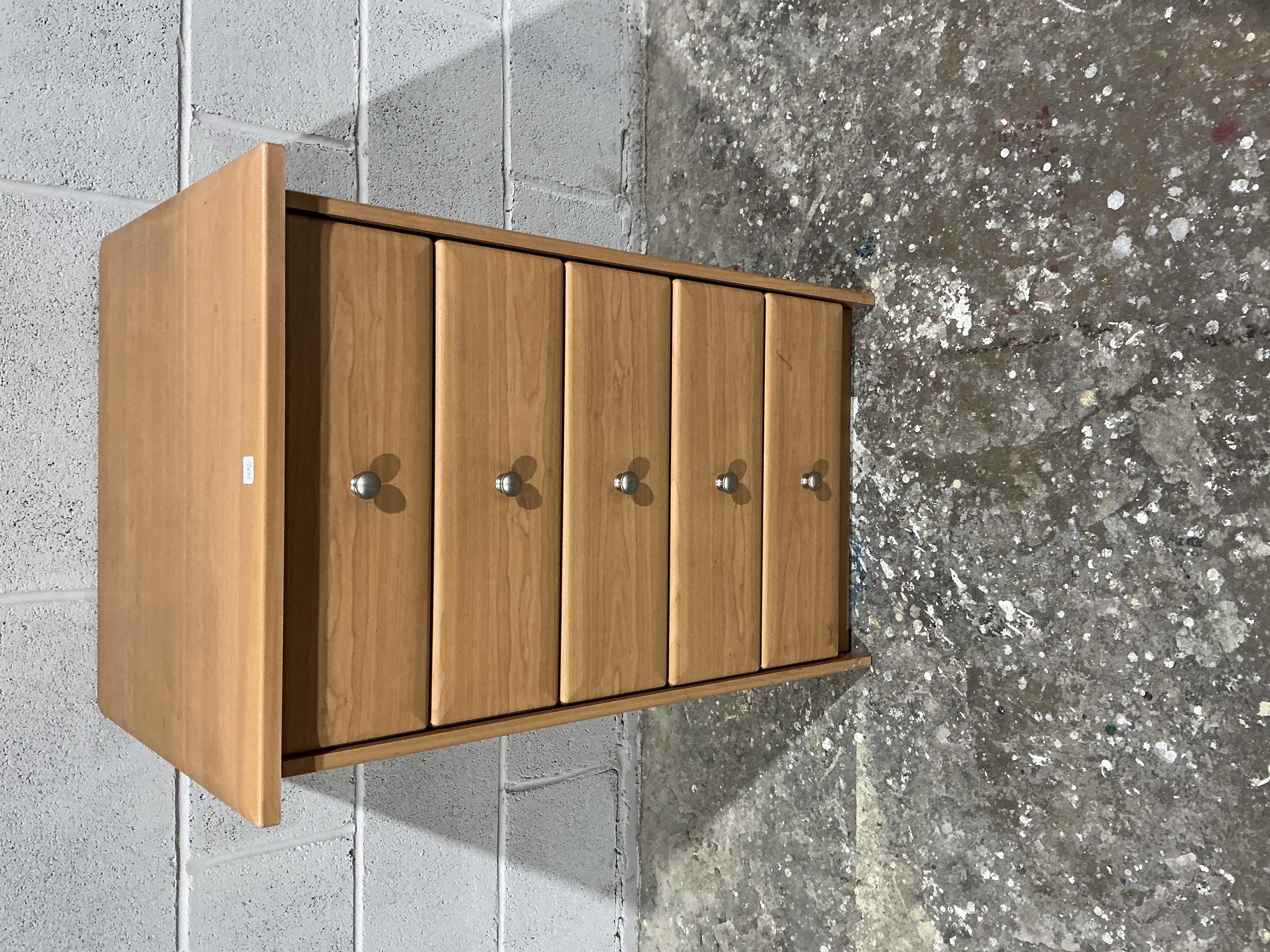 A contemporary small chest of drawers constructed from wood with a light, warm finish. The unit features five stacked drawers, each fitted with a single brushed-metal round pull knob. The piece is of a minimalist, rectangular design with a flat top and straight sides. A small white inventory label is affixed to the top surface.