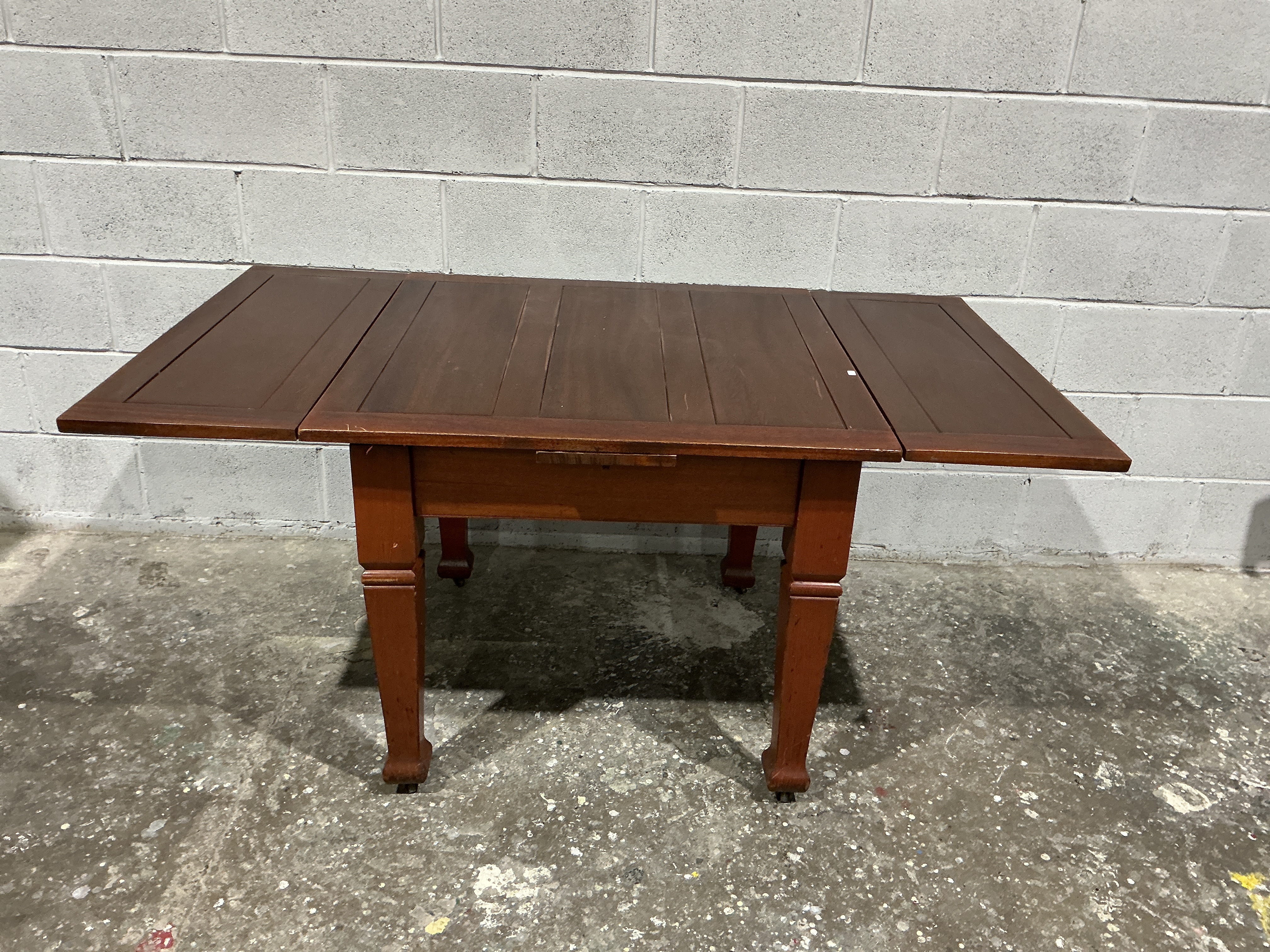 A George III mahogany drop-leaf dining table. The piece features a rectangular panelled top with two side extensions. The apron is fitted with a single shallow drawer. The table is raised on four square, tapered legs with moulded detailing, each terminating in a small caster. The table displays a two-tone stained finish, with a darker brown surface on the top and a warmer, reddish-brown tone on the base and legs.