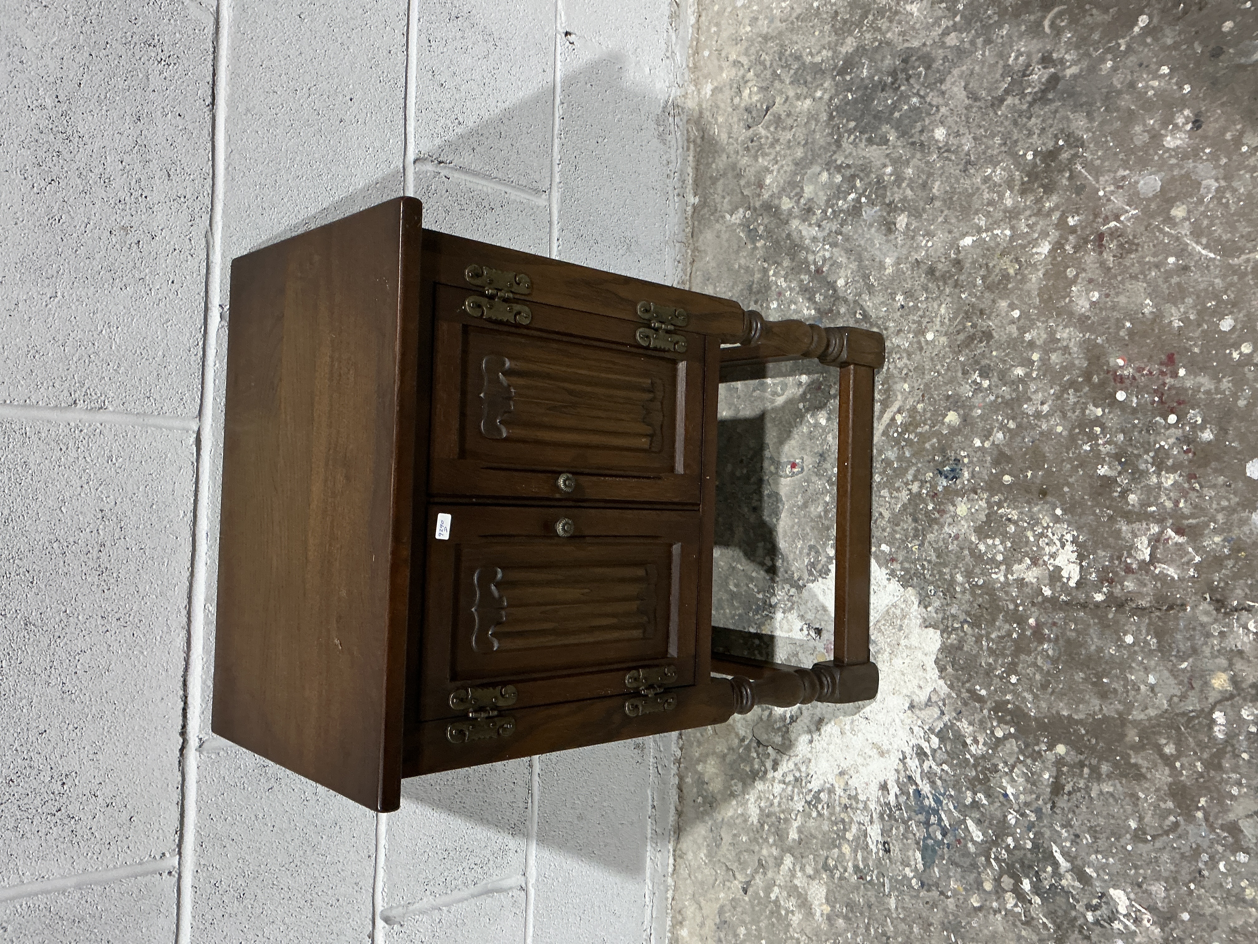 The item appears to be in overall good condition, showing minor surface wear and dust consistent with age and storage. A small white inventory label is present on one door panel.
