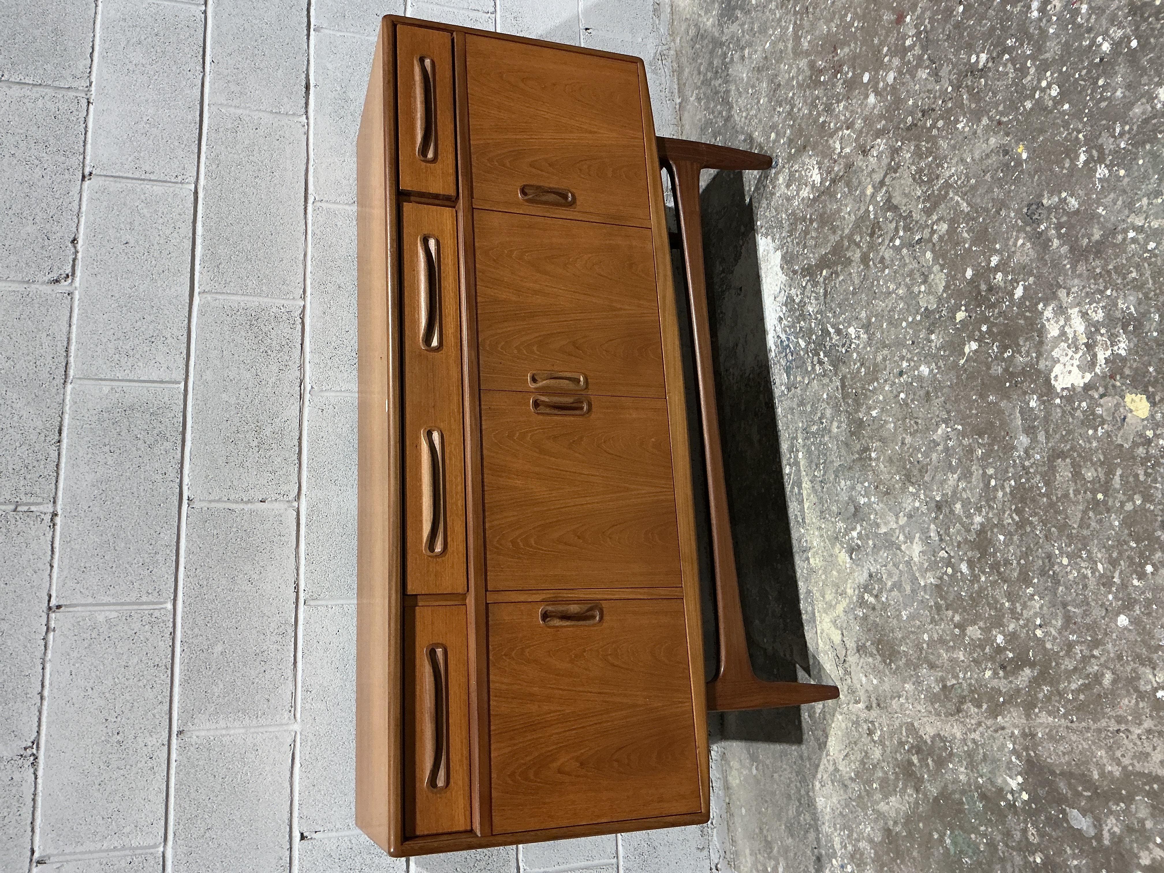 A classic Mid-Century Modern teak sideboard from the celebrated Fresco range, designed by Victor Wilkins for the British manufacturer G-Plan (E. Gomme Ltd) during the 1960s. The piece is skilfully crafted with teak veneers and features a bank of four drawers to the left-hand side, adjacent to two double-door cupboards. It is defined by its signature sculpted, integrated wooden handles and a sleek, flush-front profile. The carcass is supported by a distinctive solid teak sculptural underframe with tapered legs and a curved stretcher, reflecting the strong Scandinavian design influence of the era. The top drawer is typically fitted with a felt-lined cutlery insert. This model is a quintessential example of high-quality British mass-market furniture design from the post-war period.
