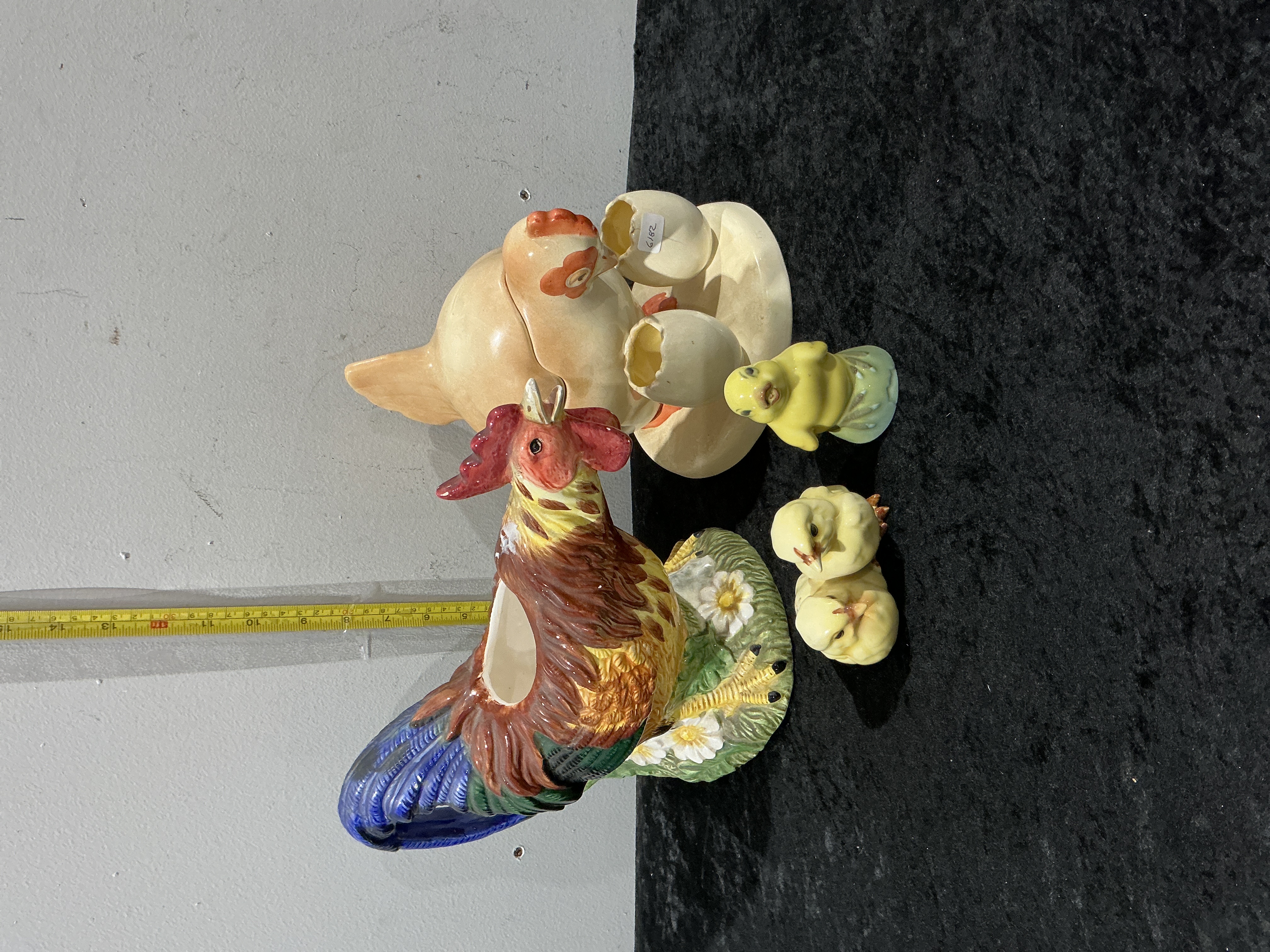 A group of five ceramic items comprising a large Regency Fine Arts rooster, a two-piece hen-on-nest egg server, and three chick figurines. The rooster is finished in a vibrant polychrome palette of deep red, mustard yellow, forest green, and cobalt blue glazes, standing on a grassy mound base decorated with molded white daisies. It features a gold oval sticker on the base reading Cockerel by Regency Fine Arts. The cream-coloured hen-on-nest egg server features a red comb and wattle, with the base containing two molded egg-cup holders and an impressed number 10 to the interior floor. The set includes a pair of huddled yellow chicks with an indistinct blue underglaze manufacturer mark and a single chick designed as a salt or pepper shaker with a circular blue mark to the underside. Rooster height 26 cm.