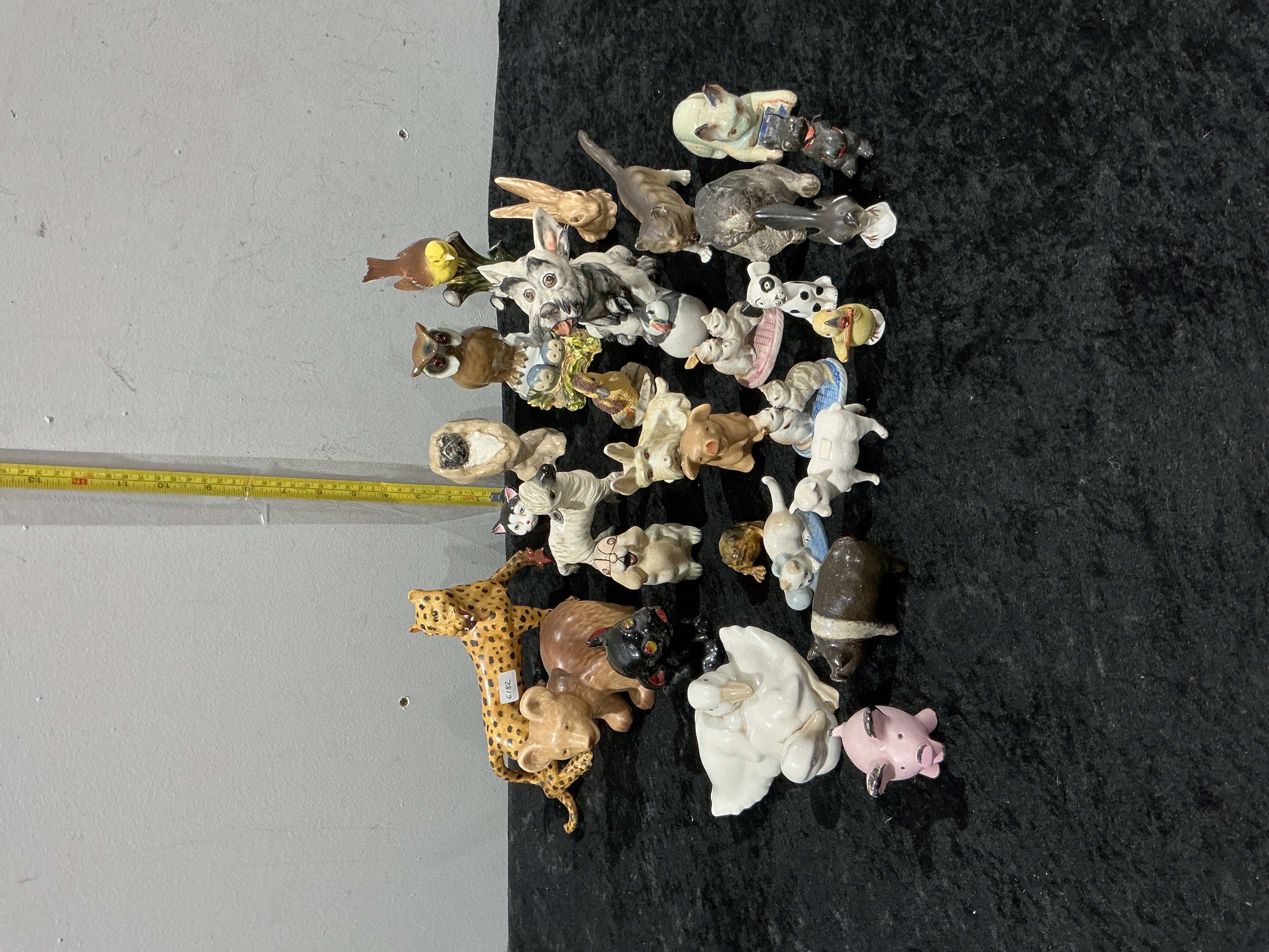 This lot comprises a diverse collection of approximately 25 decorative animal figurines. It is important to note that these items are static decorative objects and do not feature any mechanical components, coin slots, or internal mechanisms associated with mechanical banks or registers. The assortment includes a variety of subjects such as several dog breeds including terriers, pugs, and spaniels, domestic cats, a large spotted feline resembling a cheetah or leopard, an owl, a songbird, a rabbit, a pig, and a swan. The pieces are constructed from glazed ceramic and porcelain. While no prominent manufacturer marks are visible, the style is consistent with mid-century ceramic imports from Japan and Europe. There are no patent marks or moving parts. The largest piece, the spotted cat, measures approximately 8.5 inches in length. Smaller miniatures range from approximately 1 to 3 inches in height.