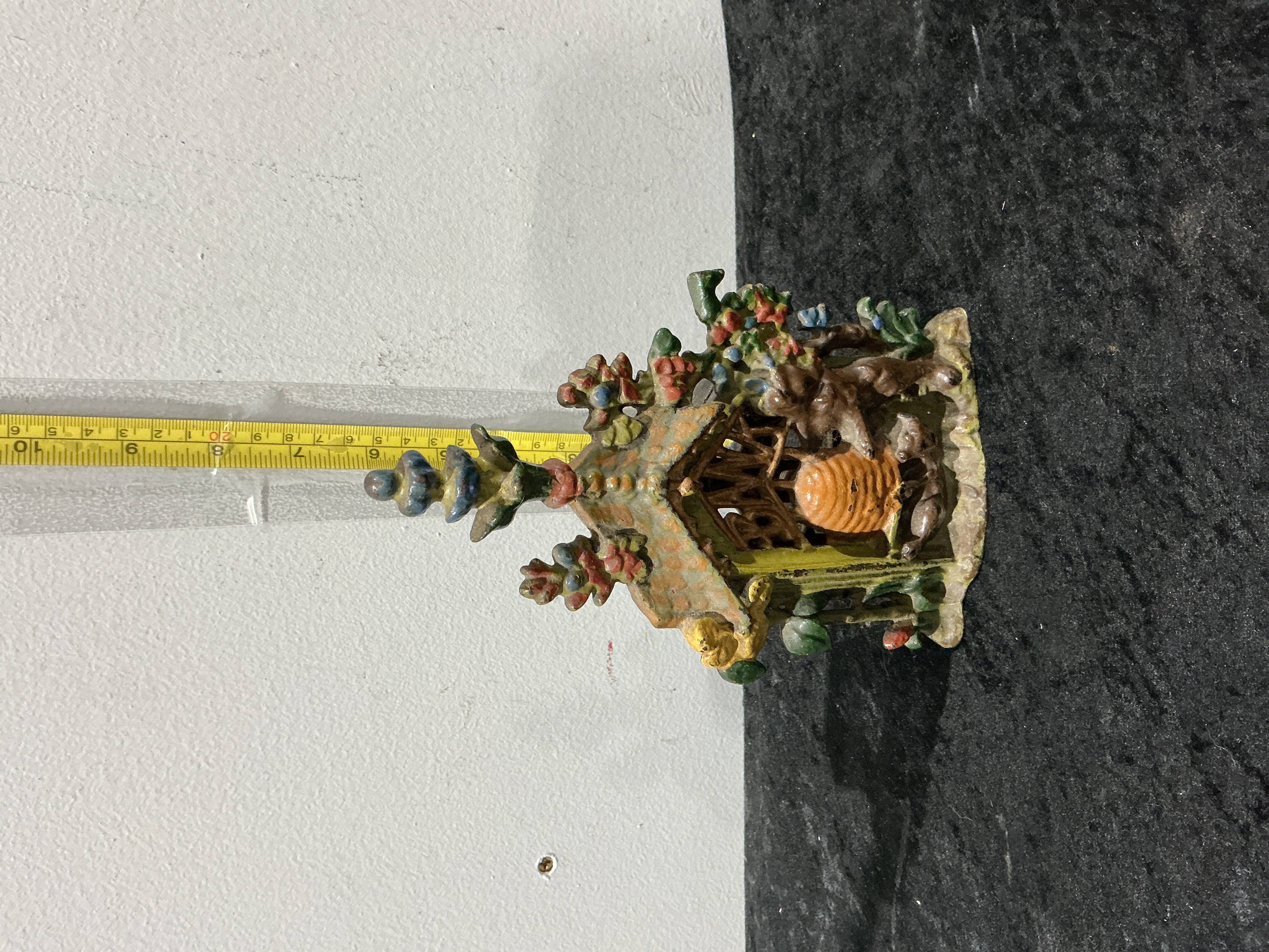 An antique polychrome painted cast iron novelty still bank, likely of American or European origin, dating to the late 19th or early 20th century. The piece is intricately cast in the form of a rustic cottage or grotto, embellished with high-relief floral and foliate motifs. At the centre, a prominent beehive is flanked by two figures of bears. The structure is surmounted by an ornate, multi-tiered finial. The bank retains a muted palette of original green, orange, blue, and yellow paint. The reverse is designed with a flat back finished in black, while the base features a perforated design secured by a single central slotted screw. This type of decorative money box reflects the Victorian fascination with whimsical and naturalistic themes in domestic metalware. Total height: approximately 9 inches.