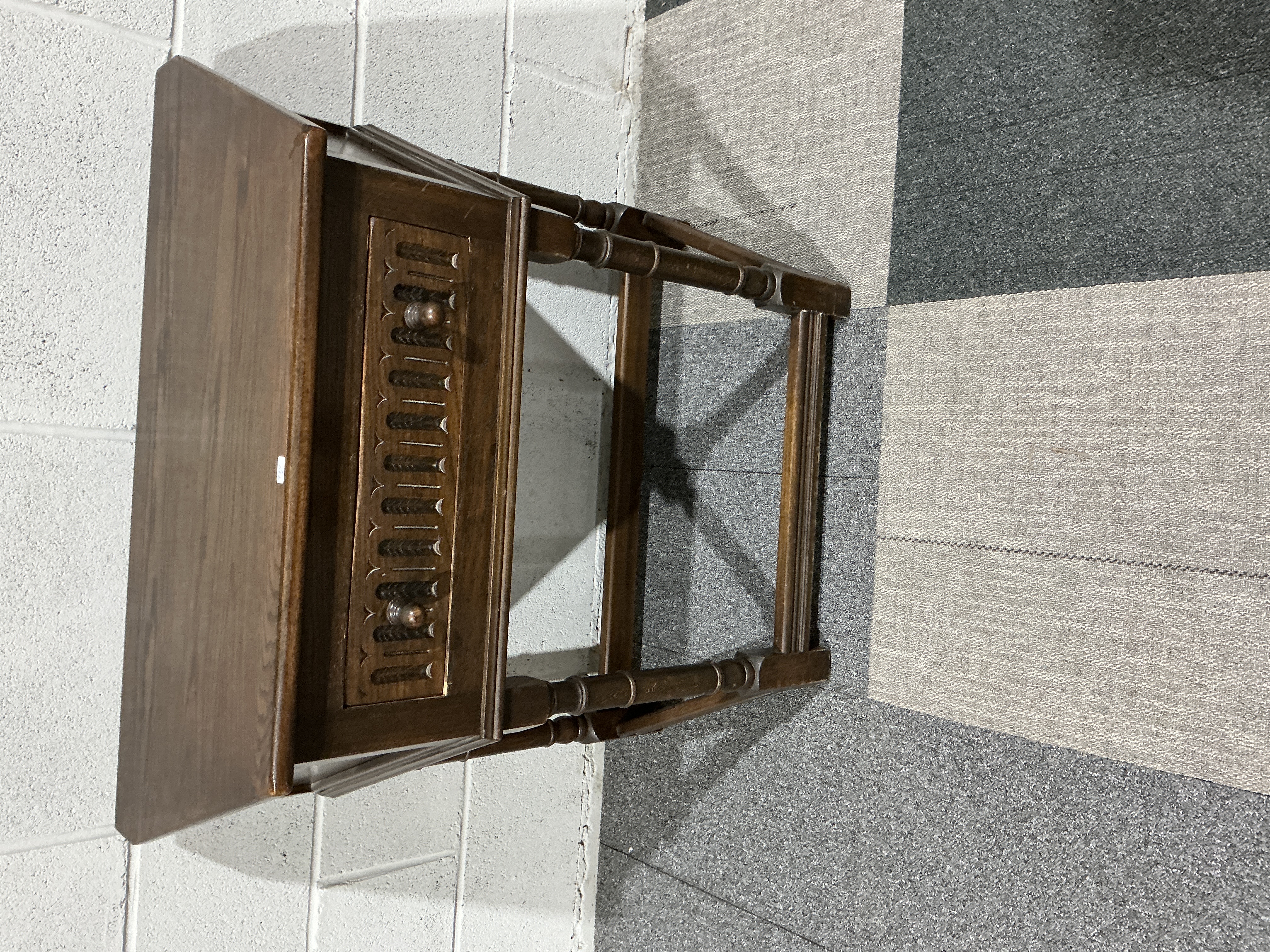An early 20th-century Tudor Revival side table, likely designed as a humidor or smoker’s stand, constructed from solid oak. The rectangular top features a single drop leaf to the rear, overhanging a deep frieze drawer. The drawer front is embellished with a central inset panel featuring traditional linenfold carving and is fitted with two turned wooden knob pulls. The piece is supported by four ring-turned legs, characteristic of the Jacobean influence popular during the 1920s, all joined by a sturdy low-level box stretcher. The timber displays a prominent grain pattern throughout, typical of English oak. This piece represents the high-quality revivalist furniture of the inter-war period, blending Art Deco era production with historicist aesthetics. 72cm H x 48cm W x 34cm D.