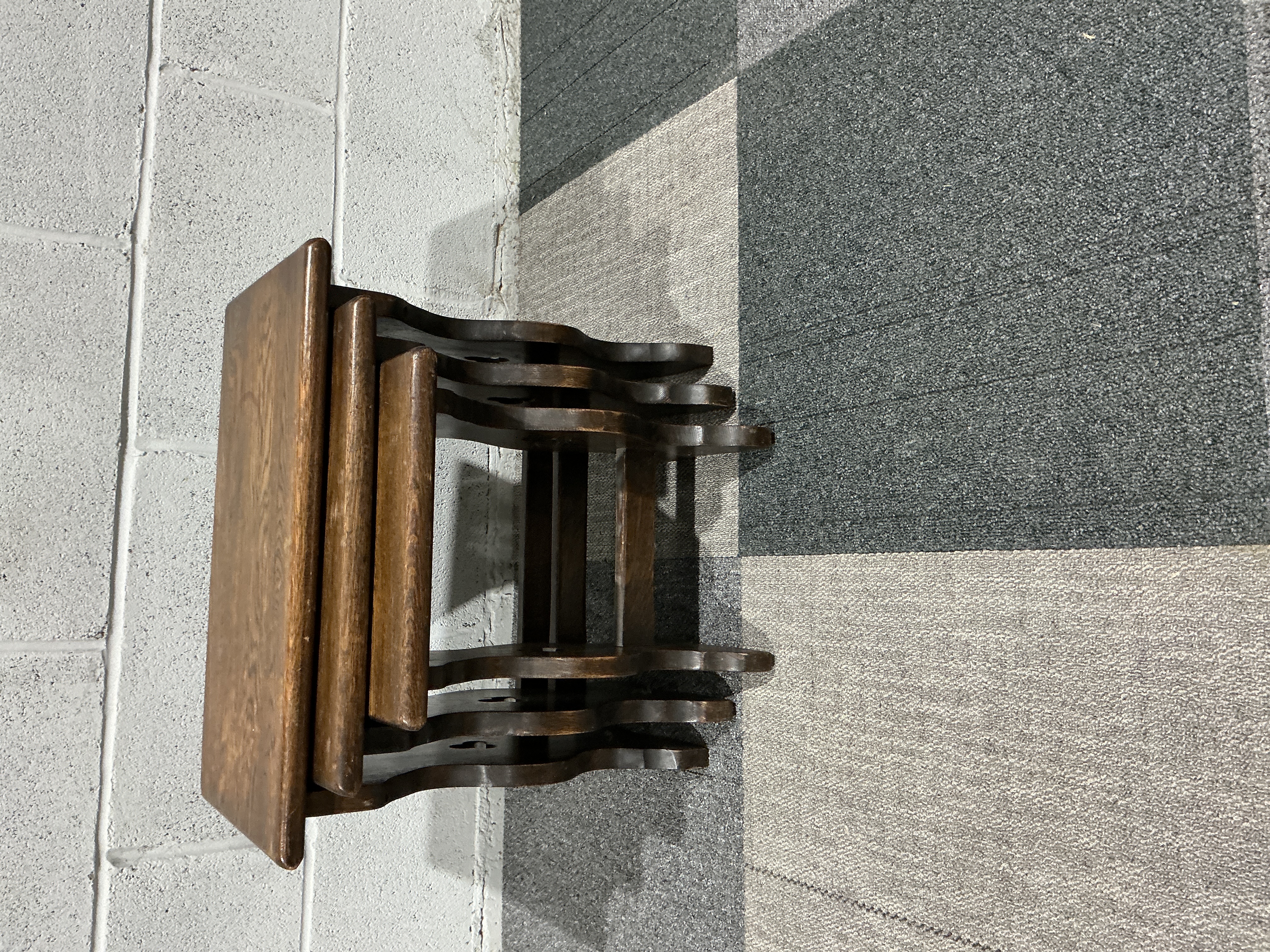 A graduated nest of three tables in the traditional revival style, dating from the mid-20th century. The set is constructed from solid oak throughout, finished in a dark stain that emphasises the natural grain of the timber. Each table features a rectangular top with rounded edges, supported by sturdy trestle-end legs. The supports are characterised by scalloped profiles and small decorative piercings, all joined by low-set rectangular stretchers for added stability. The design reflects the mid-century interest in Tudor and Jacobean revivalist forms, common in British craftsmanship of the era. No maker’s marks or stamps are present. Dimensions (Largest Table): Height 48 cm, Width 51 cm, Depth 36 cm.