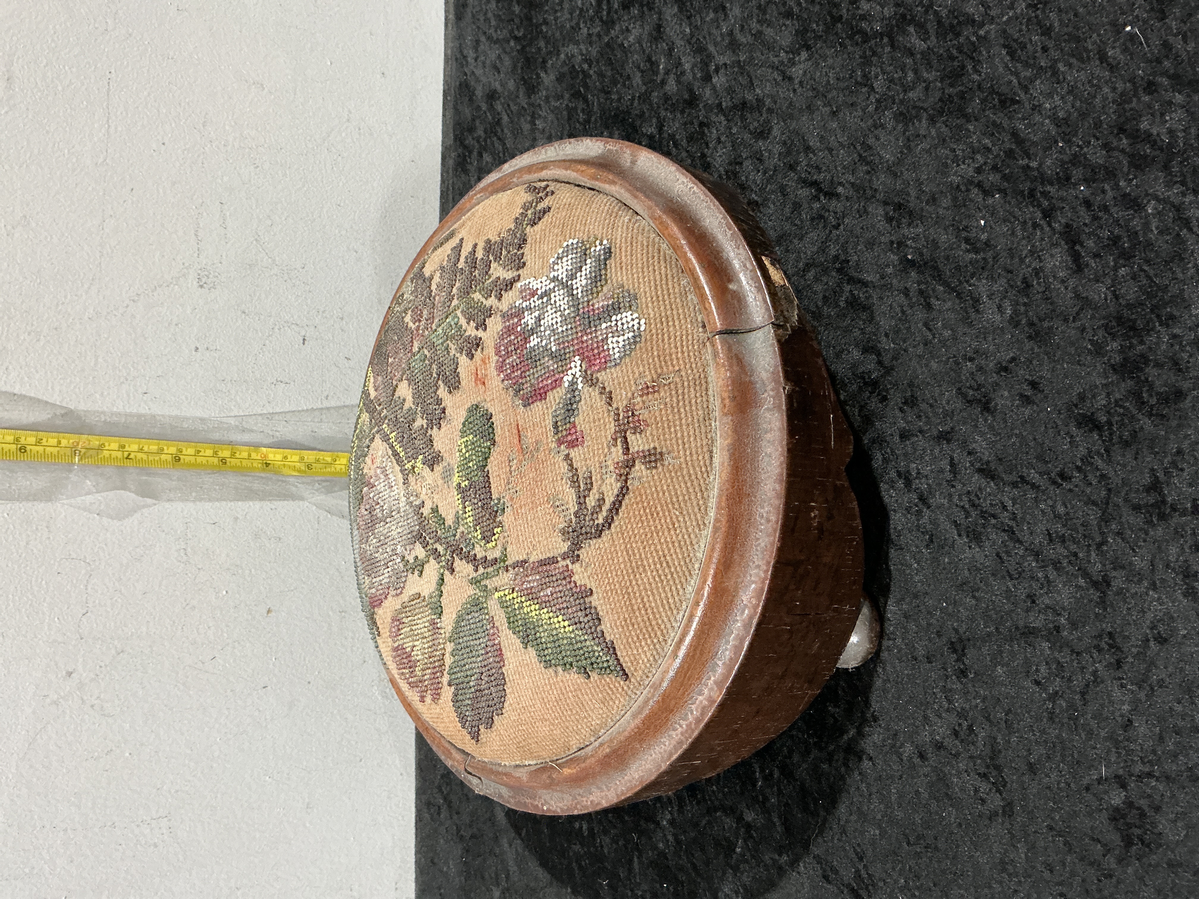 A mid-Victorian English circular ladies footstool, featuring a hand-worked glass beadwork top. The decorative programme consists of a traditional floral and foliate motif, executed in a palette of rose, olive green, and chocolate brown beads against a neutral ground. The upholstered panel is secured within a deep, turned wooden frame, likely mahogany, displaying a rich natural patina. The piece is elevated on three white ceramic bun feet, a characteristic feature of domestic furniture from this period. No signatures or manufacturer marks are present. Category: Antique Glass. Diameter: 28 cm. Height: 12 cm.