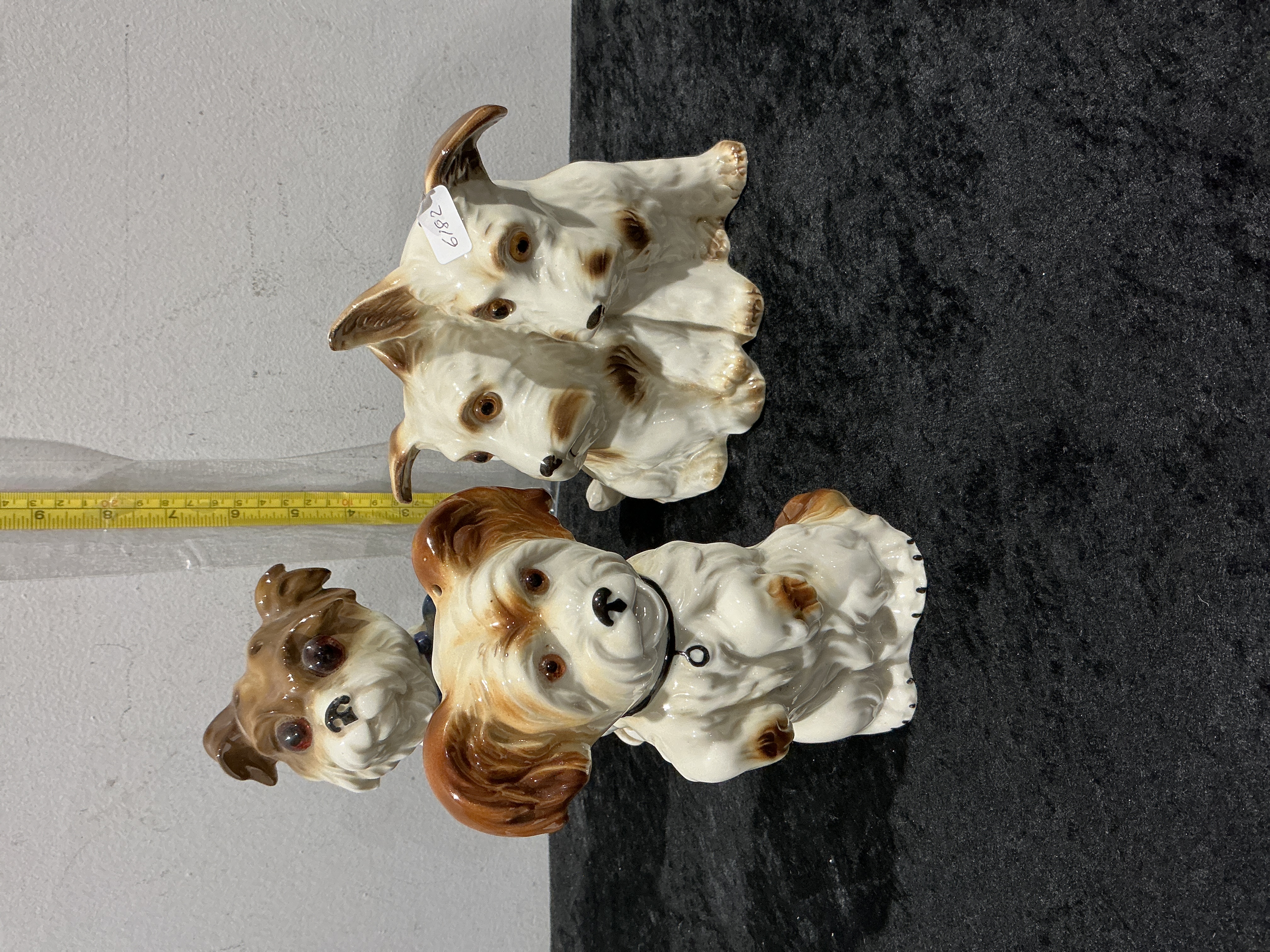 A collection of three vintage glazed ceramic dog figurines of various breeds. The lot comprises a pair of seated white and brown terriers, marked to the base with a blue underglaze Foreign stamp and incised model number 9980. The second piece is a larger individual seated spaniel-type dog with brown patches and long ears, which is unmarked. The third item is a German novelty bulldog-style dog lamp, featuring inset red glass eyes designed to illuminate from within, stamped Germany in red to the base and including an internal electrical fitting with a vintage-style brown cord. Heights approximately 11 cm to 15 cm.