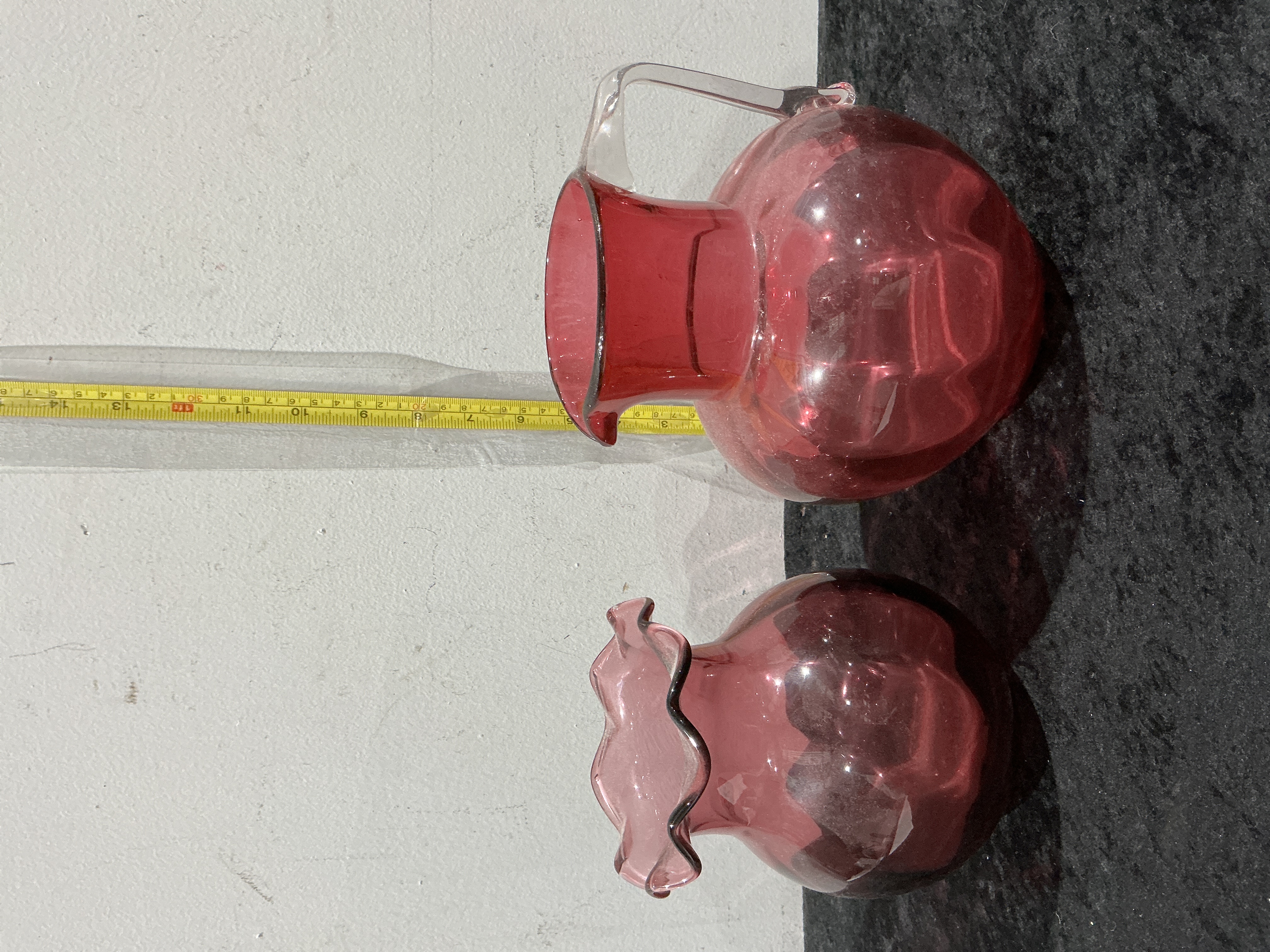 A pair of Victorian English cranberry glass vessels comprising a pitcher and a ruffled vase