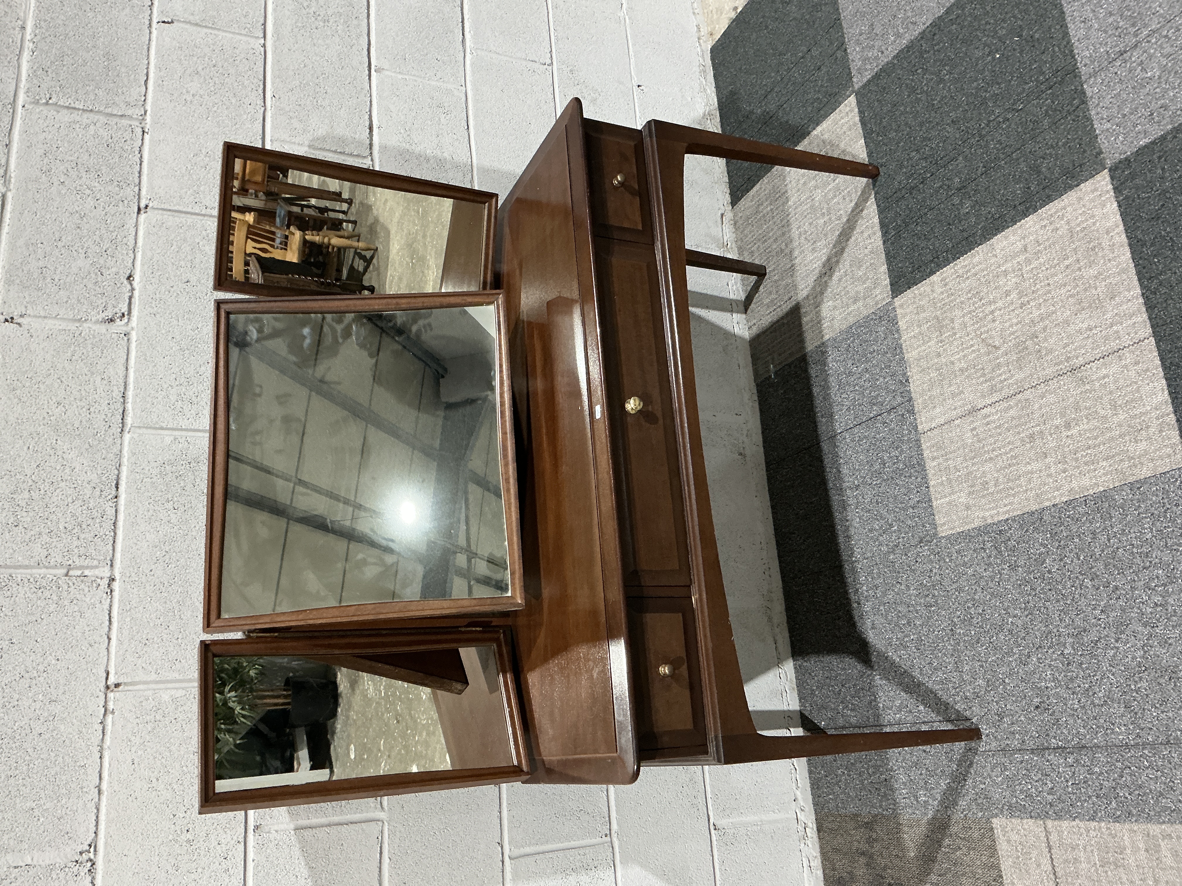 The unit is in good structural condition with no significant movement in the joints. The mahogany-veneered surfaces show minor signs of age-related wear, including light surface scuffs, faint scratches, and minor abrasions consistent with domestic use. The mirrors are in good order with no notable silvering loss or foxing. The brass-tone hardware is original and remains well-secured. There is no evidence of woodworm or major structural repairs.