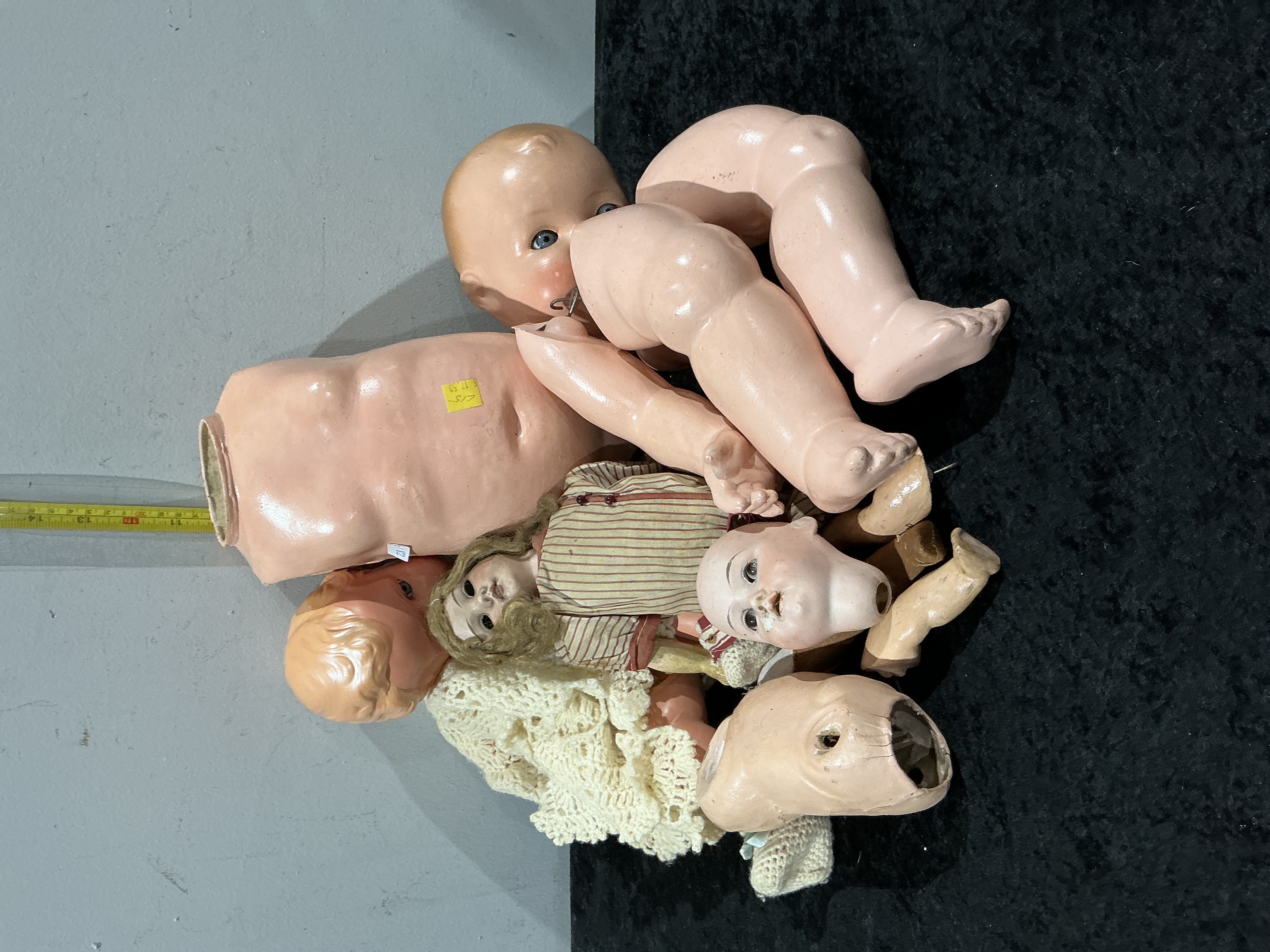 A mixed collection of vintage doll components for repair or restoration, including composition and bisque elements. The lot features a large composition baby head with blue glass sleep eyes and a bald pate, alongside a composition head with moulded and painted orange hair. Included is a small bisque-head doll with a light brown mohair wig and fixed eyes, partially dressed in a vintage striped cotton shirt and a cream-coloured lace or crocheted garment. The collection contains various composition limbs and a large torso. No maker marks are visible on the components. Torso height approximately 11-12 inches.