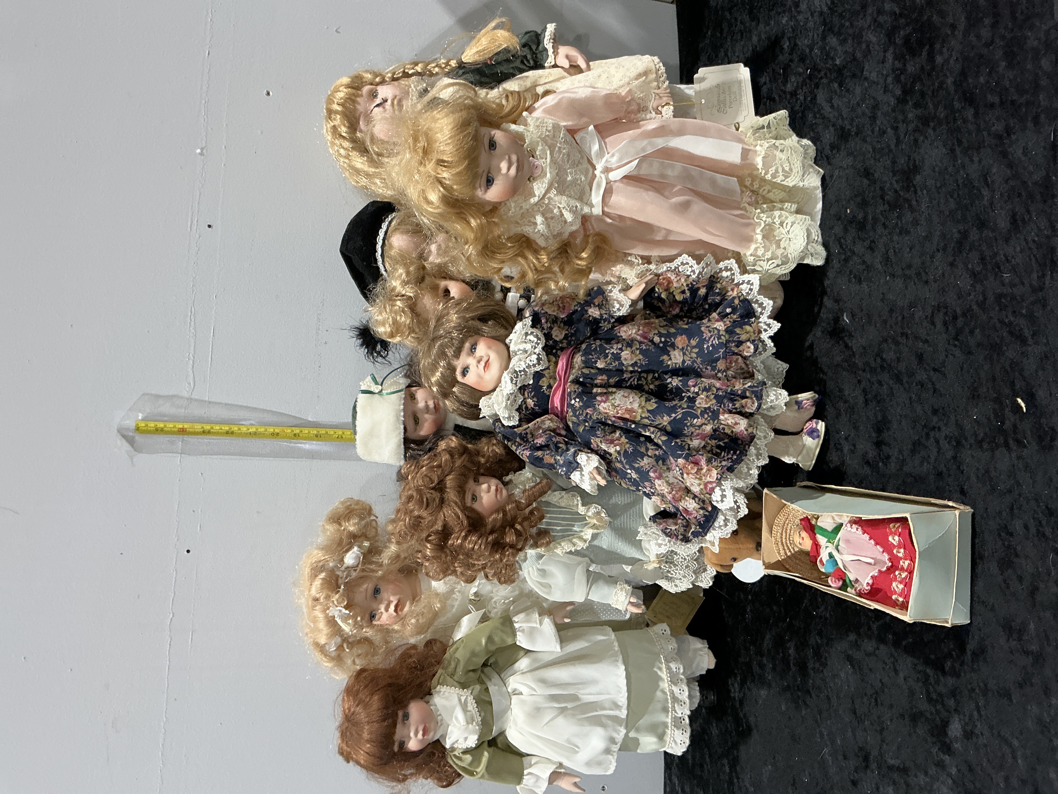 A collection of approximately ten contemporary collectible dolls, including one confirmed Seymour Mann creation with its original designer hangtag. The dolls feature bisque porcelain heads, lower arms, and lower legs attached to stuffed cloth armature bodies. Each doll is finished with fixed inset acrylic or glass eyes and applied synthetic eyelashes. The synthetic wigs are presented in various colours including blonde, brunette, and auburn, styled in ringlets, waves, and braids. The dolls are dressed in their original, elaborate multi-layered Victorian and Edwardian style costumes, featuring lace trimmings, satin ribbons, and coordinating headwear such as bonnets and floral ornaments. The lot includes one miniature doll in its original presentation box. Height 7 to 20 inches.