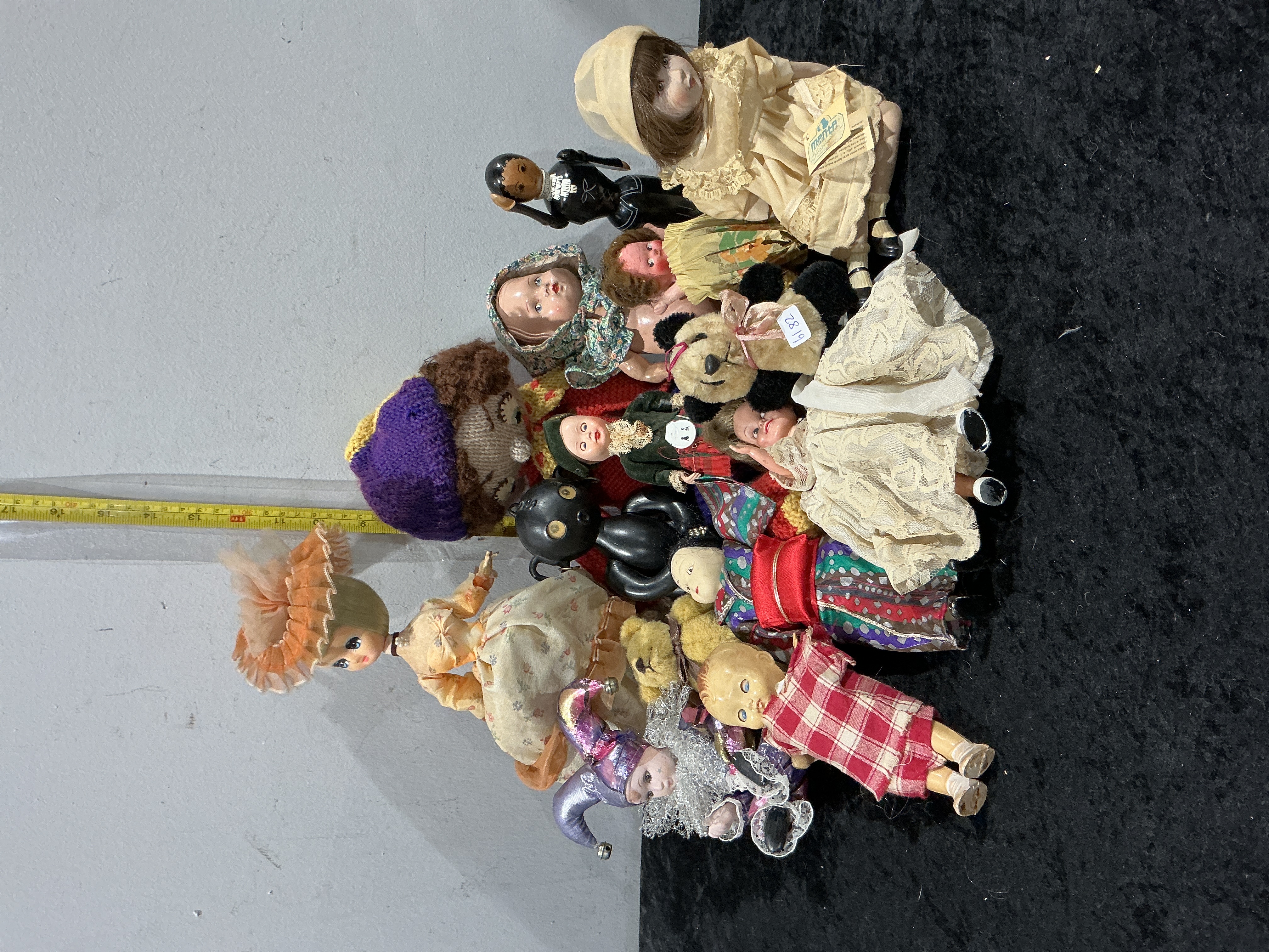 A diverse mixed lot of approximately 13 dolls and figures ranging from the mid-20th century to modern collectibles. The collection features various materials including bisque, hard plastic, vinyl, composition, and cloth. Notable items include a modern bisque collector doll, possibly by Merritts, in a cream lace outfit with stationary inset eyes and a synthetic wig, a small bisque jester figure in a metallic costume with tinsel hair, and several mid-century hard plastic dolls featuring sleep eye mechanisms. The lot also contains a large 1960s-style vinyl doll with side-glancing eyes, a composition doll head in a floral bonnet, a knitted yarn figure, a small plush teddy bear, and a stylised black cat figure. Most dolls retain original or period-appropriate clothing such as lace dresses, knits, and plaids. Height ranging from 3 to 12 inches.