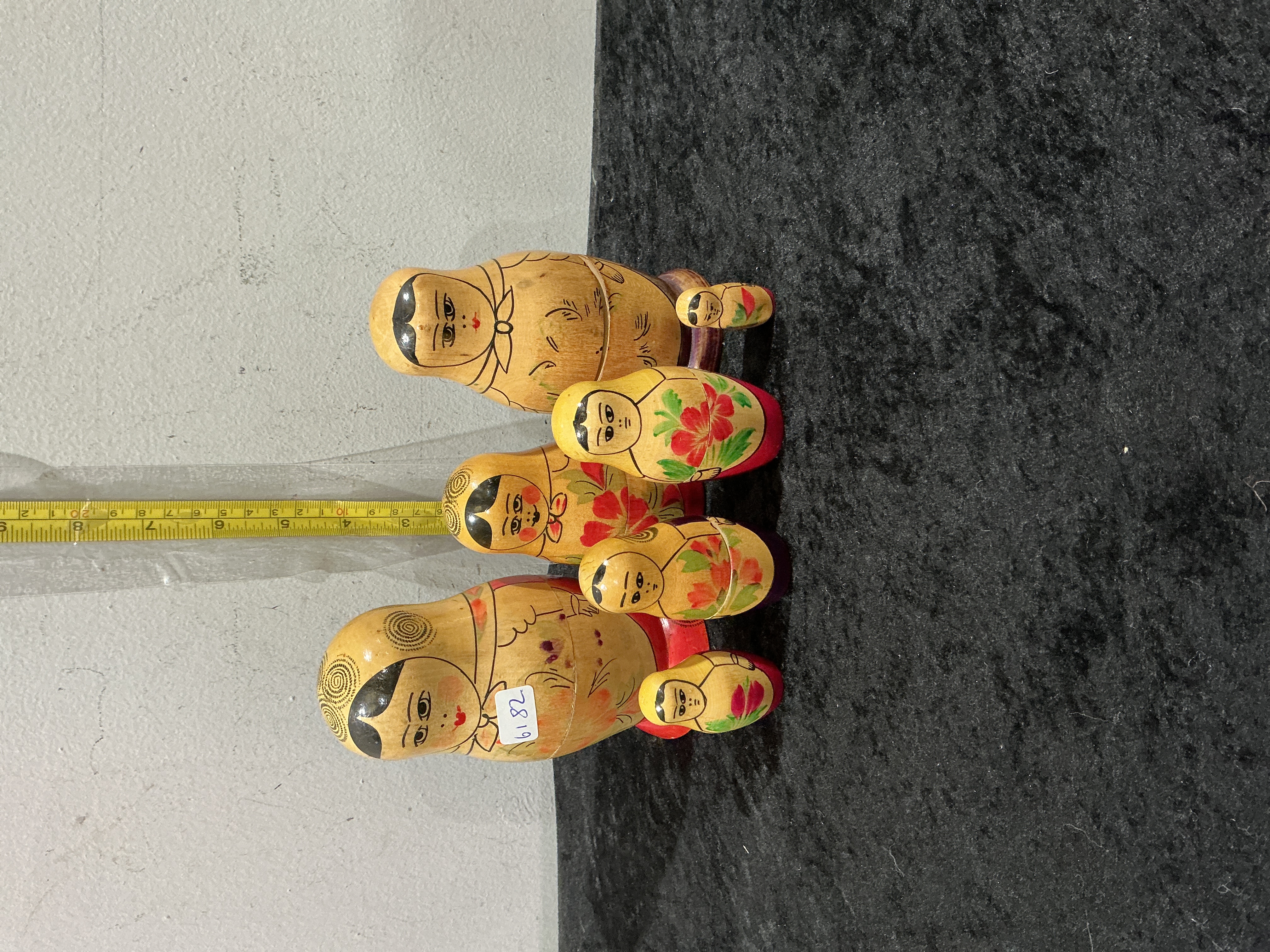 Produced by an unidentified Soviet workshop, this set of six hand-painted nesting dolls (matryoshka) is crafted from turned wood. Each figure depicts a traditional peasant woman wearing a colourful kerchief and apron decorated with red and green floral motifs. The facial features and clothing outlines are defined through a combination of black paint and pyrography (wood-burning), with the largest doll featuring a distinctive spiral-patterned hair motif. No maker’s marks or Cyrillic signatures are present; however, the largest figure retains an adhesive auction label numbered 6182. This set is a typical example of mid-to-late 20th-century Russian folk art production from the USSR. Dimensions: Height of largest doll 15 cm.