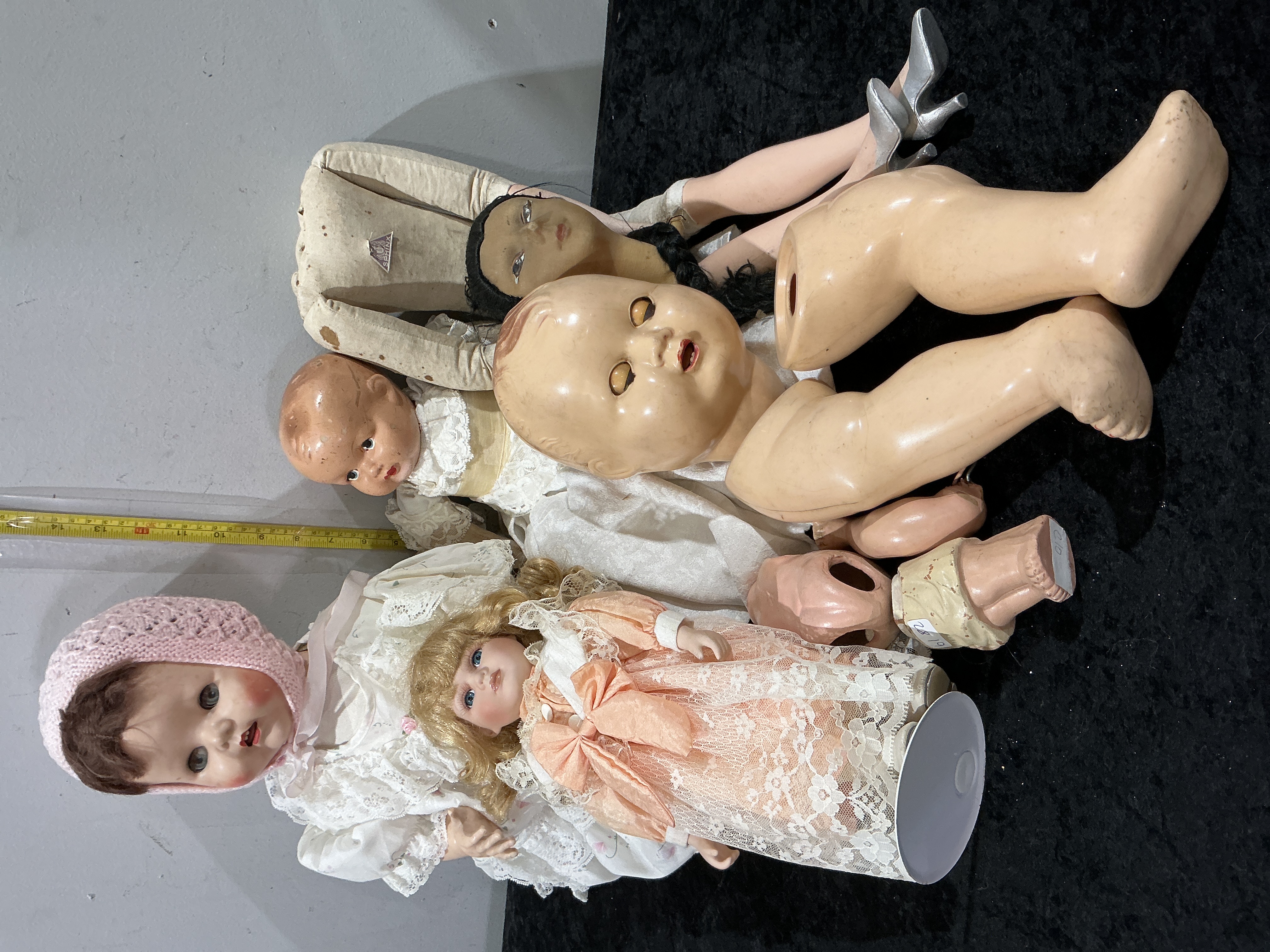 This miscellaneous lot features a variety of vintage dolls and components, primarily consisting of composition baby dolls, a contemporary bisque collector doll, and a cloth-bodied doll. A notable maker mark includes a triangular SPHINX brand label on one cloth torso. The composition dolls feature moulded and painted hair, while the collector doll has a blonde synthetic wig and the cloth-bodied doll has a dark fibre wig. Eye mechanisms vary, with several dolls possessing weighted sleep eyes and others featuring fixed glass or painted eyes. The dolls are dressed in assorted lace and fabric garments, including bonnets and dresses, which appear to be a mixture of period-appropriate pieces and later replacements. The lot includes various loose composition limbs and a large detached head. Height 10 to 18 inches.
