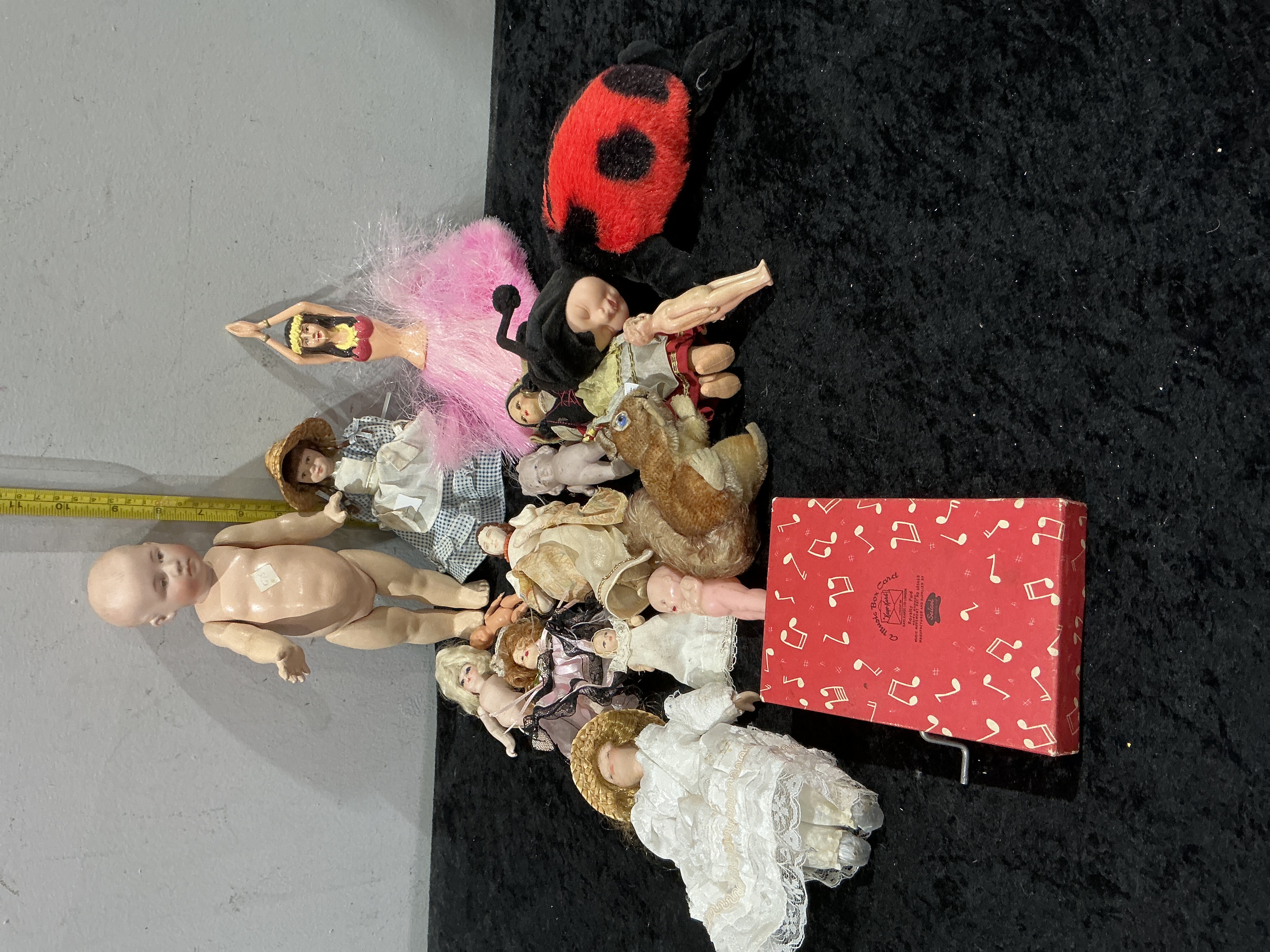 A varied collection of vintage dolls and miniatures, including a large composition baby doll with a five-piece jointed body and moulded, painted facial features. The lot features several storybook-style dolls, similar to Madame Alexander designs, crafted from hard plastic and vinyl with synthetic wigs and original costumes including a blue gingham dress and a lace gown. The collection includes a Norcross A Music Box Card made of red cardboard with a metal crank, a plastic hula doll, and two plush toys including a ladybug and a mohair-style animal. Eye mechanisms include a mix of painted and plastic sleep eyes. Height 5 inches to 11 inches.