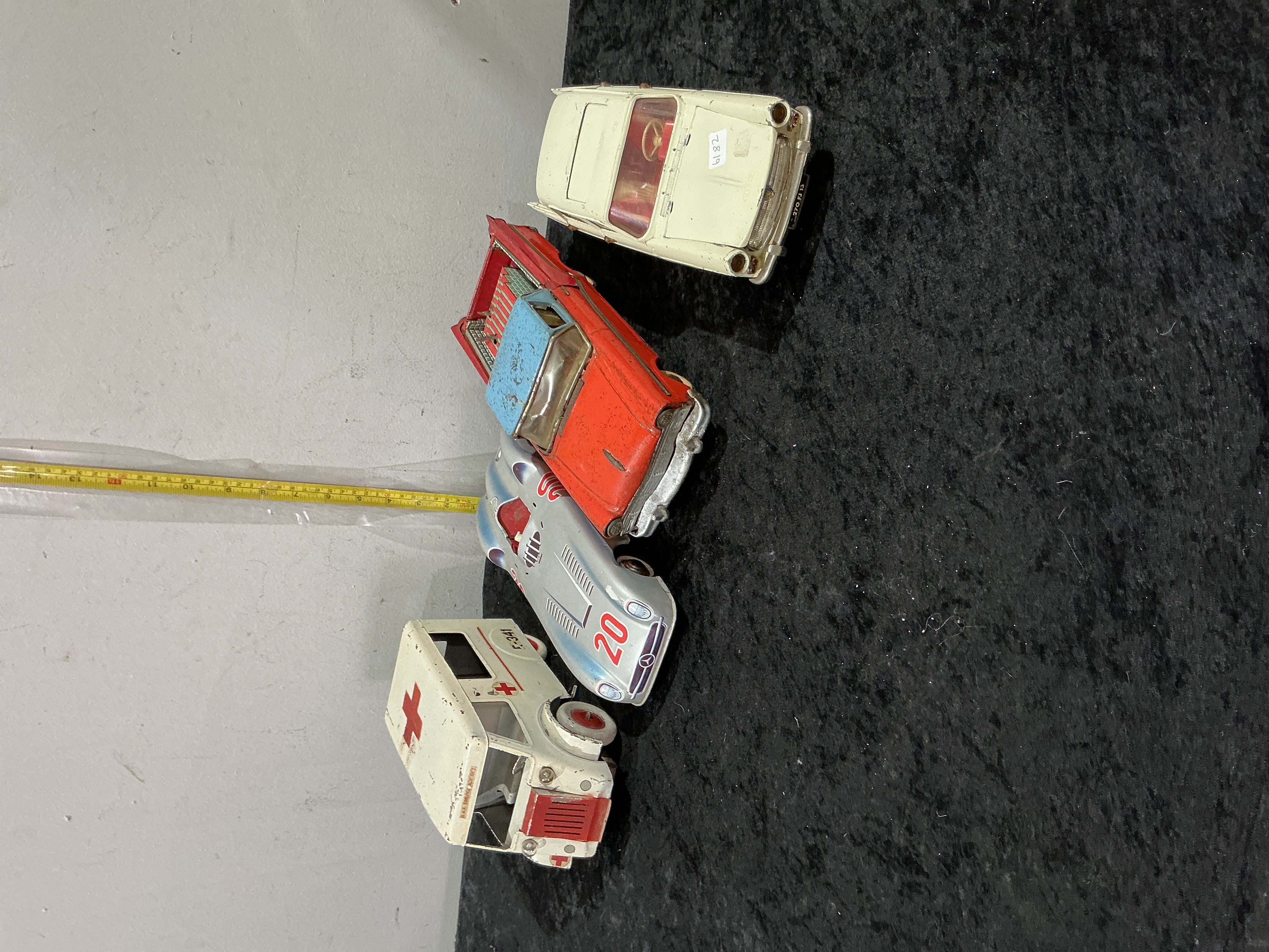 This lot comprises four vintage tinplate toy vehicles of European and potentially Japanese origin. Included is a Joustra Peugeot 404 sedan finished in cream with a detailed red interior, marked Made in France on the base. Also present is a Mercedes-Benz W196 Streamliner style racing car in silver with racing number 20, likely manufactured by JNF of Germany. The collection is completed by a lithographed tinplate ambulance featuring red cross motifs, the markings F-341 and PR 75, and white rubber tyres, alongside a red friction-drive pickup truck with a light blue cab roof and celluloid windows. All vehicles are equipped with friction or clockwork mechanisms. No original boxes are included. Era circa 1950s-1960s.