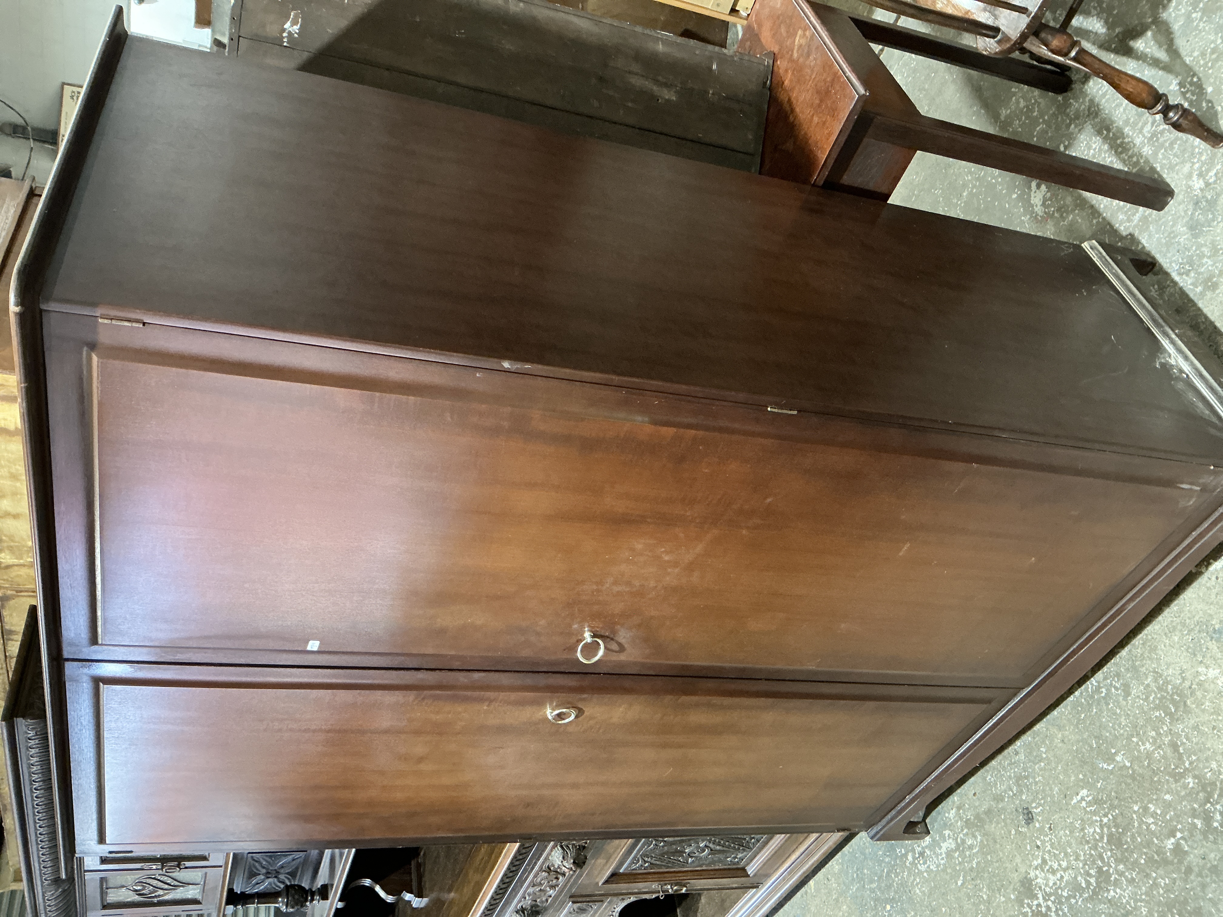 Structurally sound with no major defects. The finish shows signs of age-related wear, including scuffs to the top cornice and the feet. Light surface scratches and dust are present throughout the exterior. The doors operate smoothly and the original hardware is present. No visible evidence of woodworm or significant veneer loss.