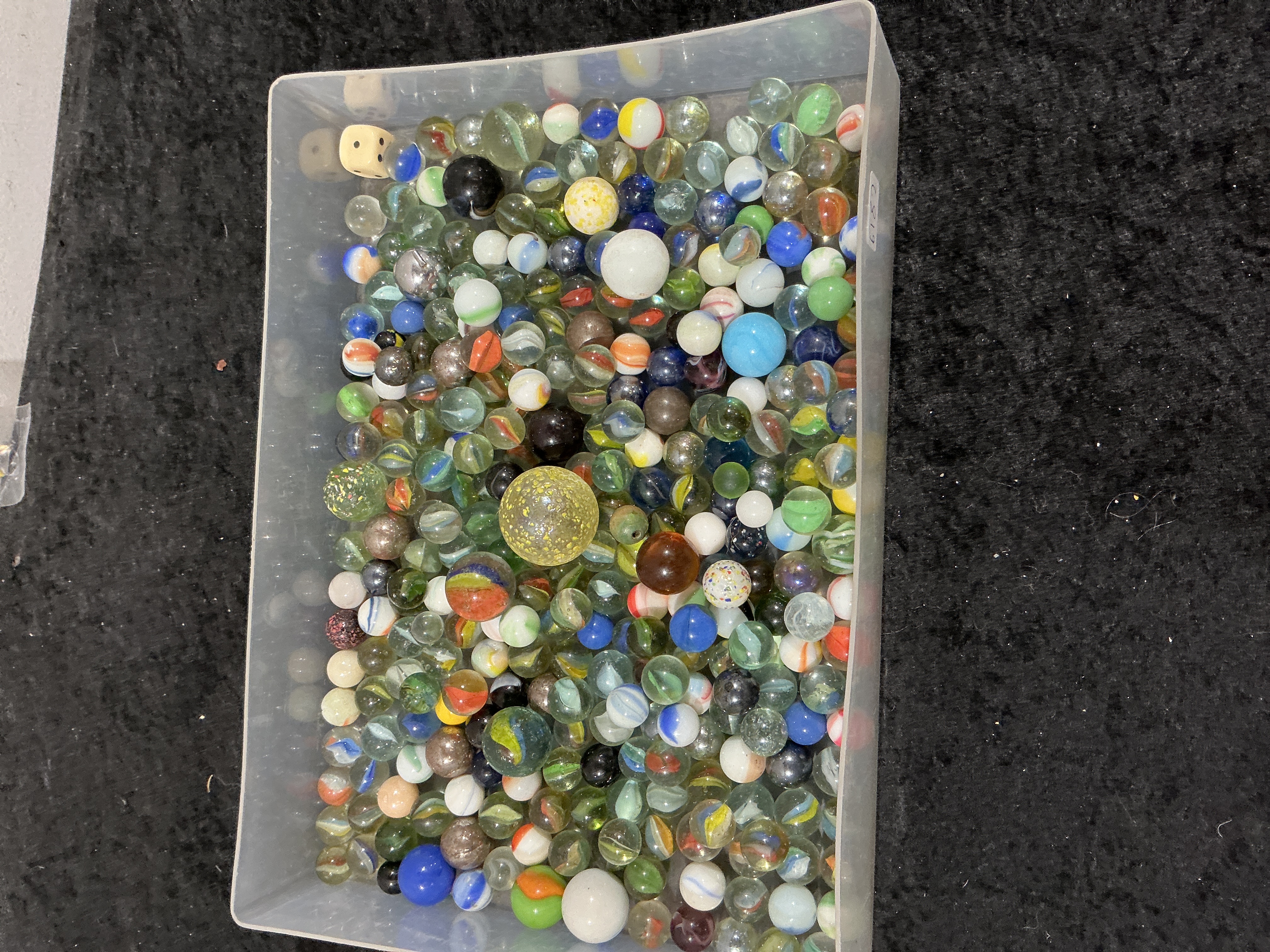 This extensive collection comprises approximately 500 glass marbles of varying styles and dimensions. The lot includes a diverse range of patterns such as classic cat’s-eyes, solid opaque colours, multi-coloured swirls, and clear translucent examples. Notable within the assortment are several larger “shooter” marbles, including a distinctive yellow textured sphere positioned near the centre. The collection is housed in a translucent rectangular plastic storage container and includes a single wooden six-sided die. While specific manufacturers are not individually identified, the variety suggests a mix of mid-century to modern machine-made glass examples, likely including makers such as Vitro Agate, Akro Agate, or Marble King. The materials are primarily soda-lime glass. No measurements were provided for individual pieces or the container.