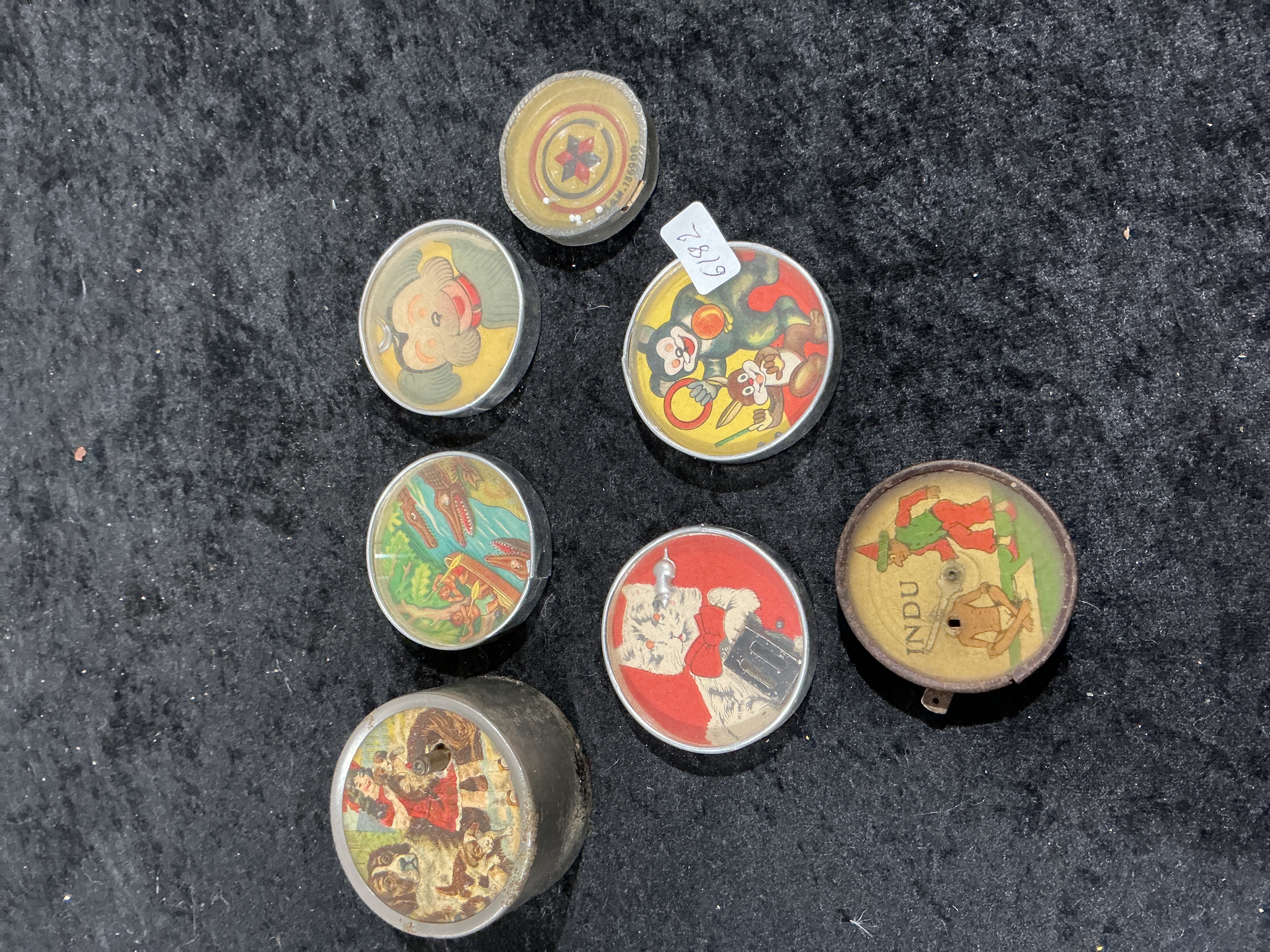 The collection is in varied vintage condition, showing signs of age-appropriate wear. There is visible surface oxidation on the metal rims and minor scratches to the transparent covers. The lithographed colours remain generally bright, though some fading and minor paint loss are present. One item retains a small adhesive inventory label numbered 6182. All internal components appear to be present, though the functional movement of the internal balls may be affected by minor internal debris or oxidation.