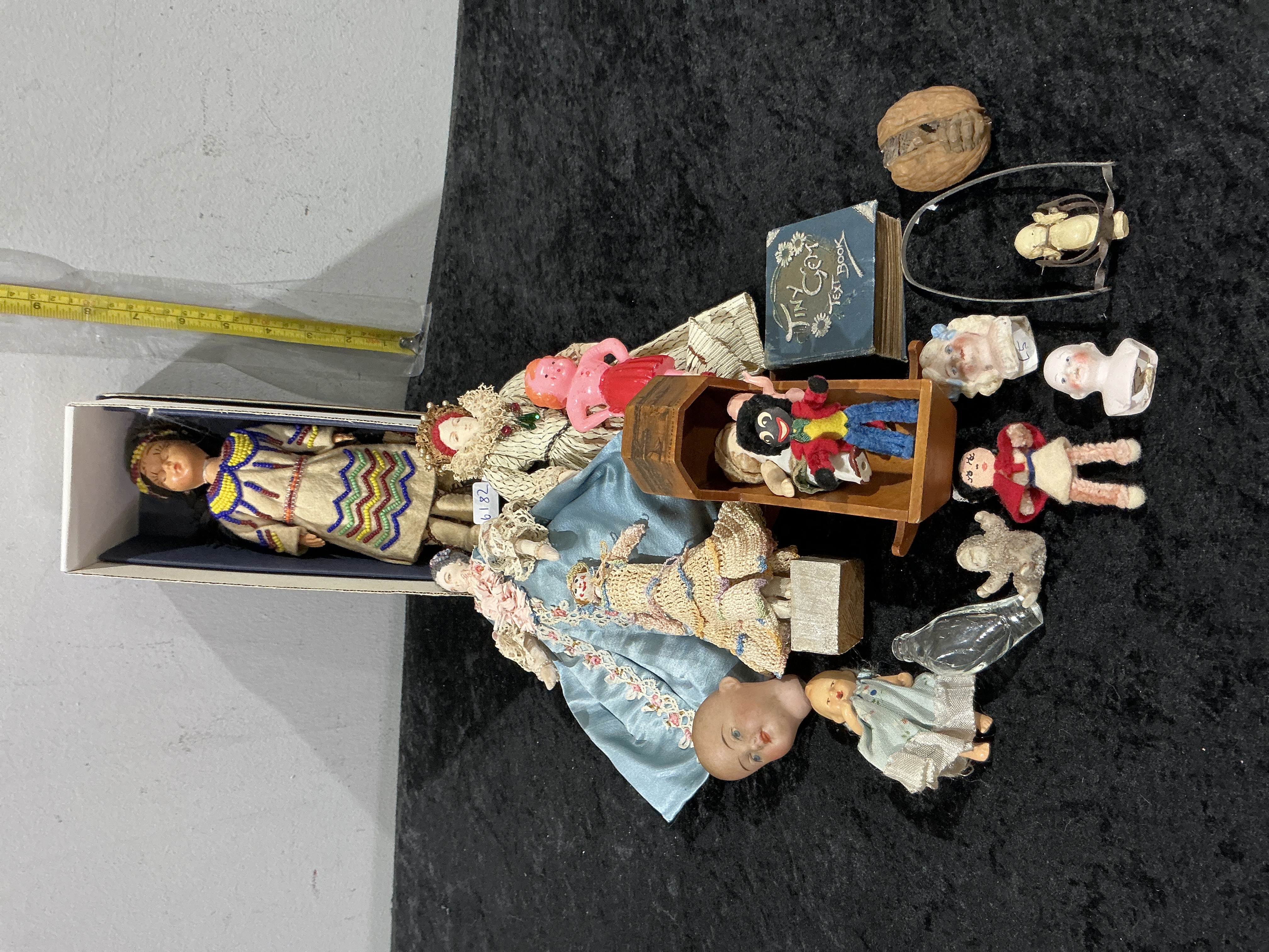 A diverse assortment of mid-20th century and earlier dolls and accessories. The collection features an unmarked Indigenous-style souvenir doll with a hard plastic or vinyl head, sleep eyes, and a dark synthetic wig, dressed in an original multi-coloured beaded felt outfit and housed in its original box. Also included is a doll with a composition or bisque head on a cloth body, featuring painted eyes and a short fibre wig, wearing an original blue satin gown with lace trim. The lot further comprises a pink celluloid doll with moulded features, an all-bisque miniature with pipe-cleaner limbs, a miniature bisque baby in a metal spring-loaded carrier, and a composition doll in a blue checkered dress. Novelty figures include a cloth Golliwog-style doll and a stockinette-headed clown. Accessories include three individual doll heads (two bisque, one composition or celluloid), a stained wood cradle, a Tiny Golden Text Book, a clear glass bottle, a moulded animal figurine, and a walnut shell. Heights range from 1 inch to 8 inches.