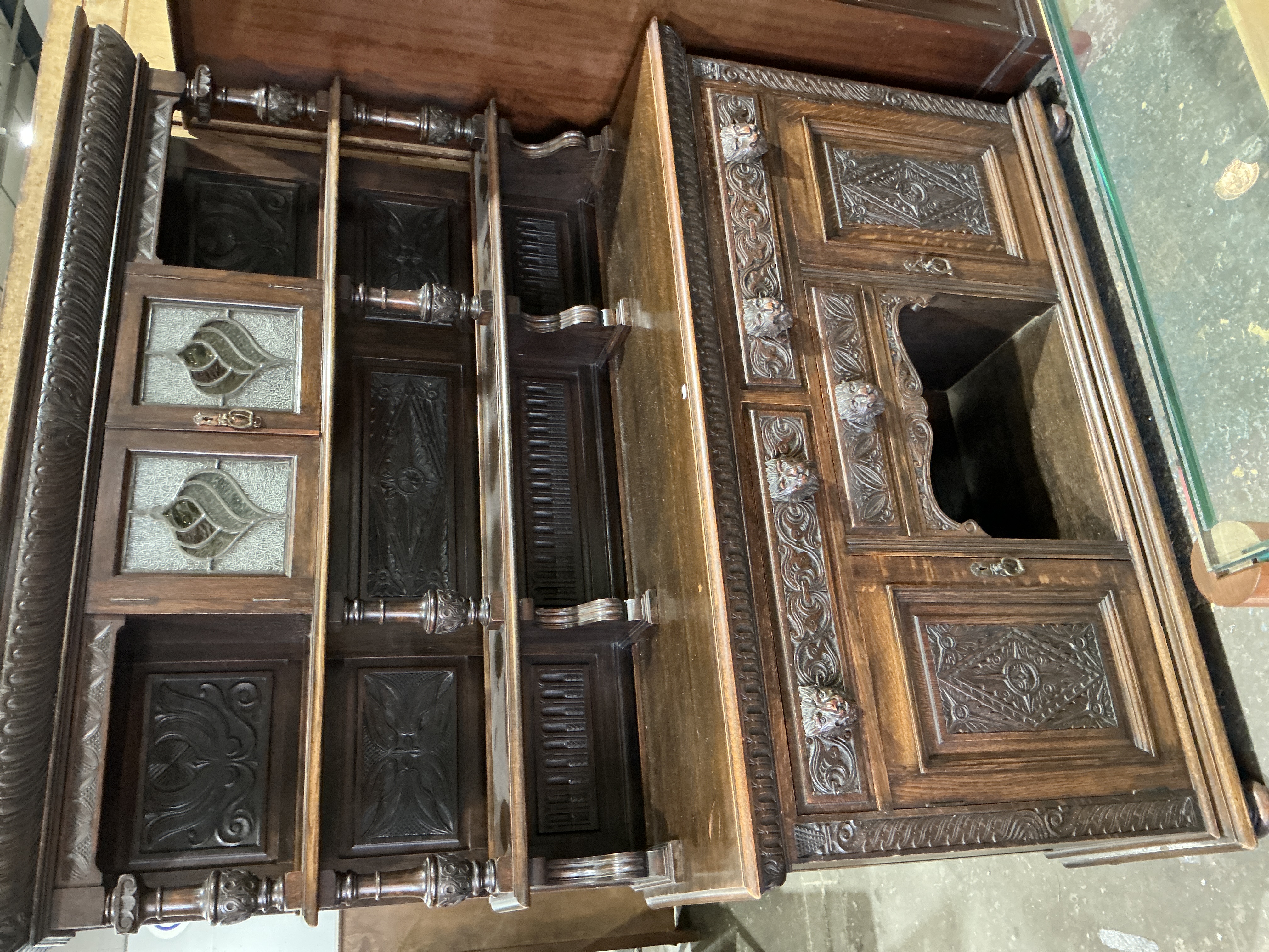 The piece is in fair condition overall but requires restoration. There is a significant loss to the lower right-hand section where a cupboard door or decorative panel is missing. Surface wear is evident throughout, including scratches, abrasions to the finish, and minor chips to the carved elements. The leaded glass remains in good order. Hardware is a combination of original carved oak and later cast metal fittings.