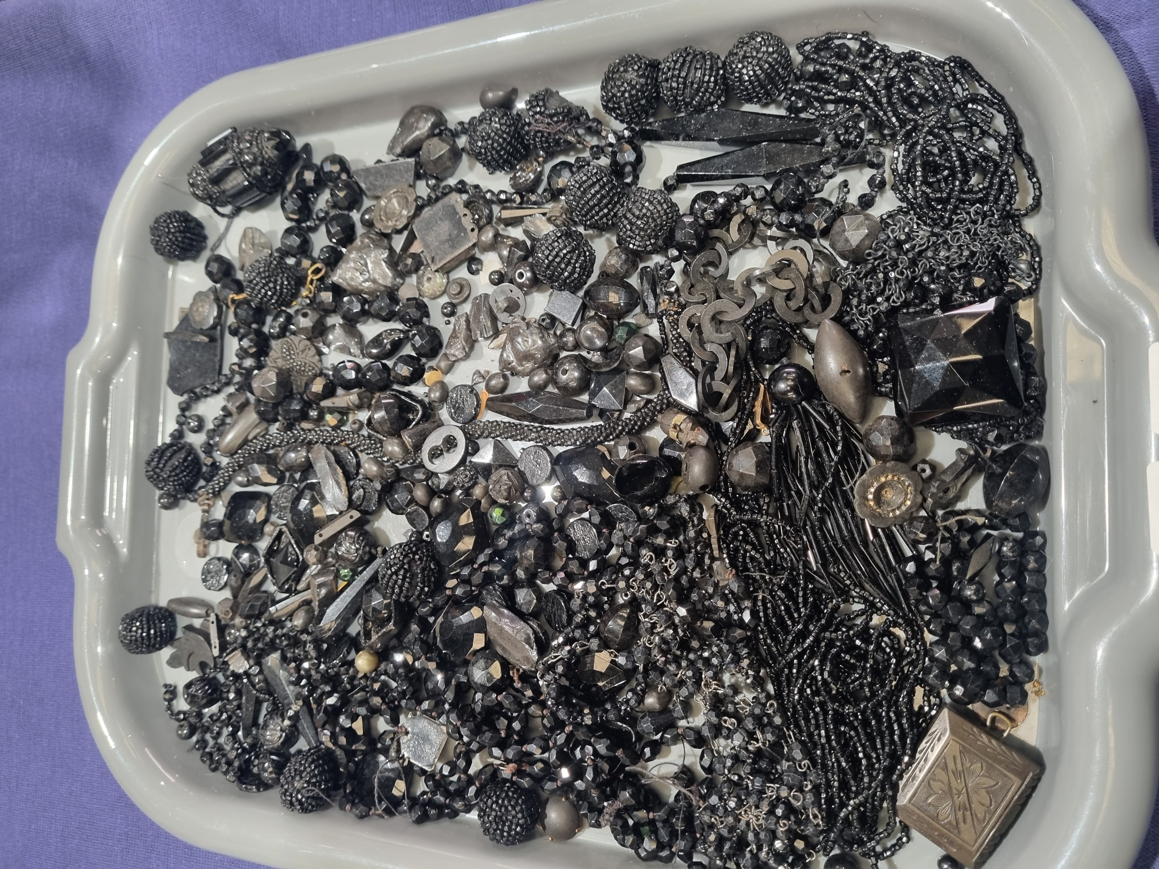 An assortment of black costume jewellery and jewellery-making components. The collection includes various materials such as faceted glass beads, molded plastic and resin components, seed beads, and base metal elements including chains and clasps. Featured items include a rectangular base-metal locket with engraved foliate decoration and several large spherical beads with a textured encrusted surface. The lot contains multiple strands of seed beads and various geometric faceted shapes. The pieces range in style from mid-to-late 20th-century costume jewellery to items in the style of Victorian mourning jewellery. No maker marks or signatures are visible on the components.