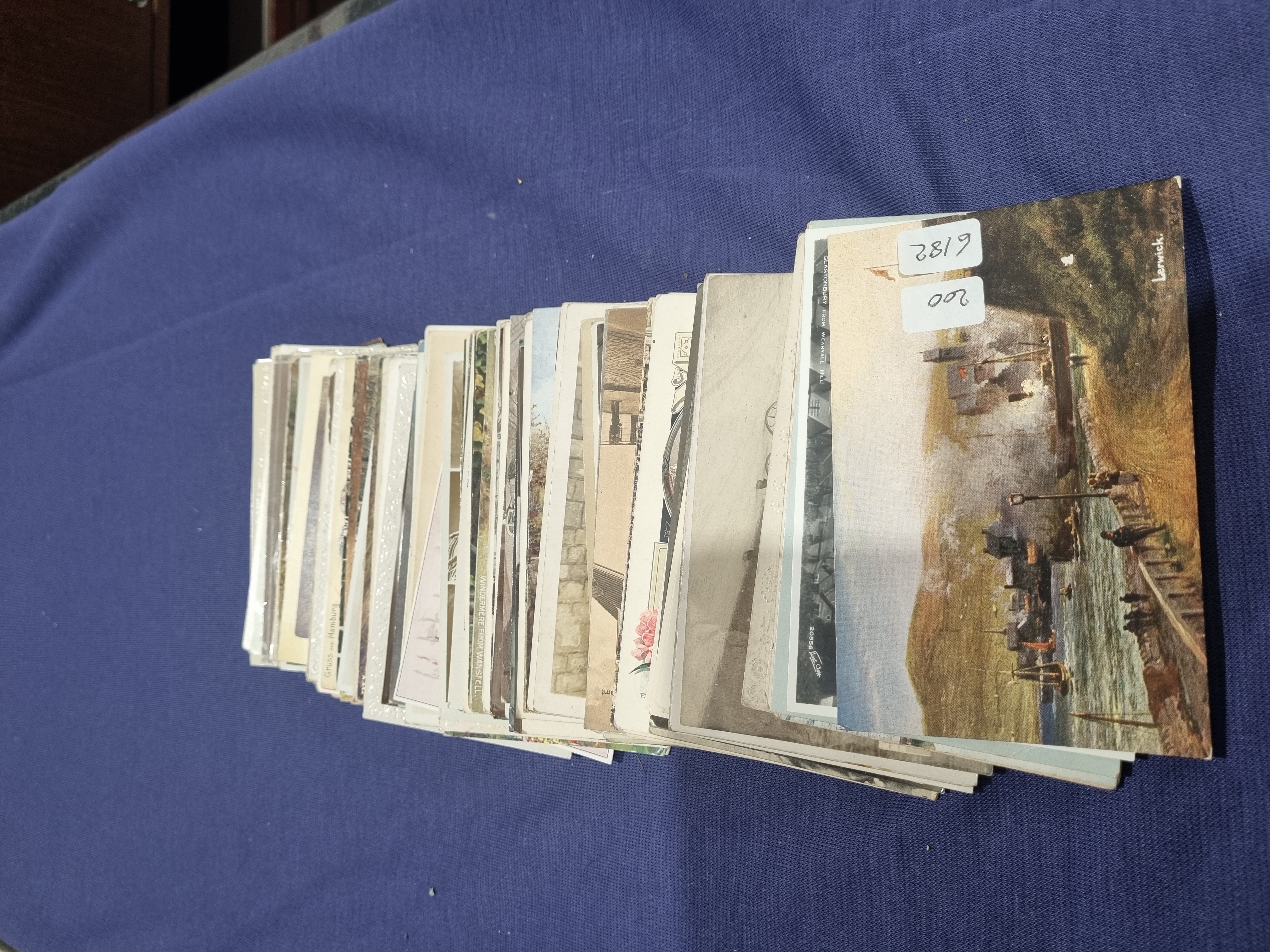 An assortment of topographical and souvenir postcards dating from the early to mid-20th century. The collection includes a variety of United Kingdom and international subjects. Identifiable locations include Lerwick, Shetland; Glastonbury from Wearyall Hill, Somerset; Windermere from Wansfell, Lake District; and Hamburg, Germany, the latter featuring the printed text Gruss aus Hamburg. The cards consist of a mixture of tinted and monochrome photographic prints alongside printed illustrations. Various publishers are represented throughout the lot. The top card bears two contemporary auction labels with the numbers 6182 and 200.