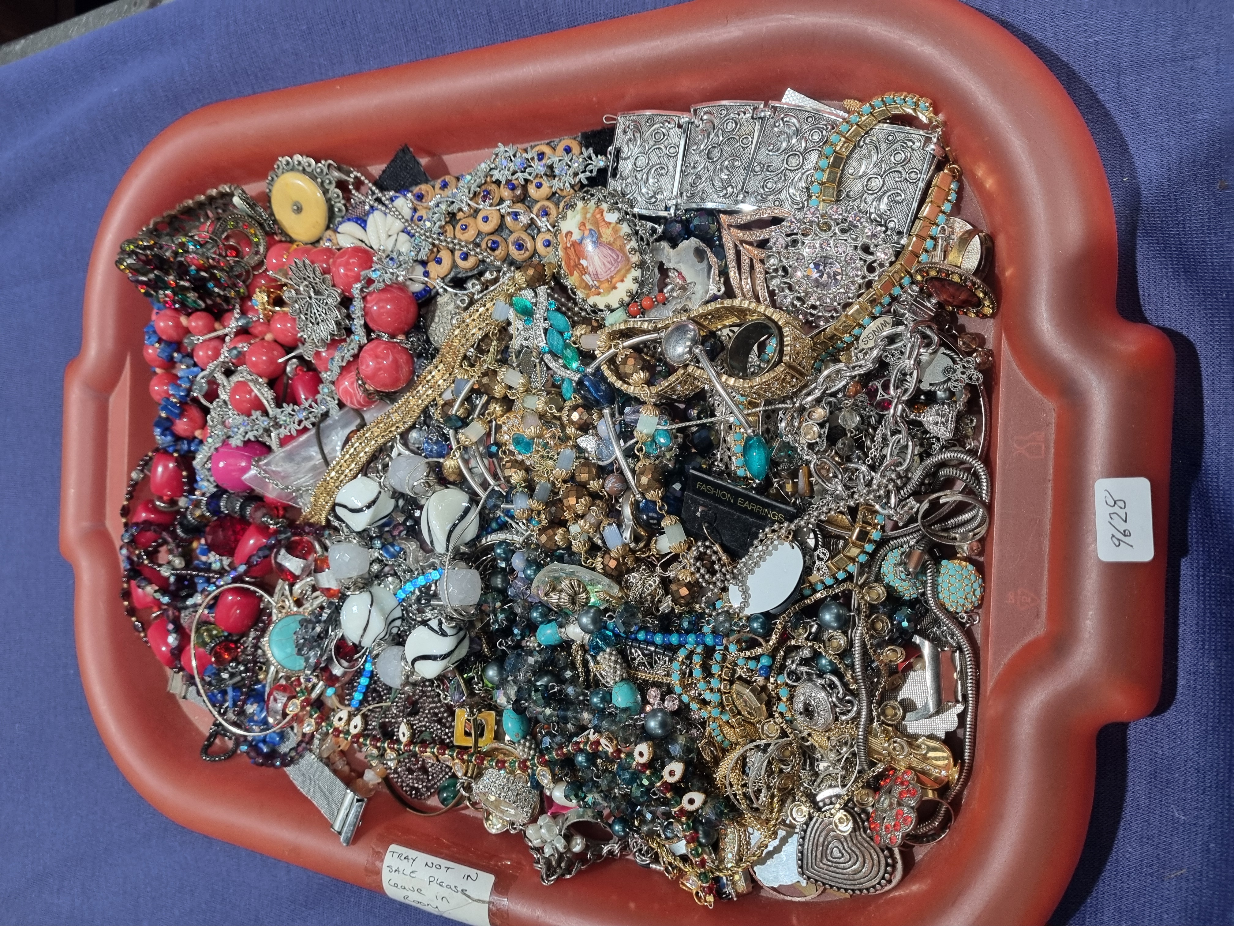 A large collection of assorted costume jewellery and wristwatches. The assembly includes a variety of necklaces, bracelets, brooches, and earrings. The items are primarily manufactured from yellow and white-tone base metals, incorporating polychrome glass beads, faux pearls, turquoise-coloured stones, multi-coloured rhinestones, and filigree metalwork. Specific items of note include a brooch with a painted pastoral scene, beaded strands in red and blue, and silver-tone bracelets with ornate scrollwork. One pair of earrings remains on a black retail card printed with FASHION EARRINGS. No metal purity hallmarks or specific maker’s marks are visible. The collection is presented in a red plastic tray with a handwritten note stating TRAY NOT IN SALE PLEASE Leave in ROOM and a label marked 9628.