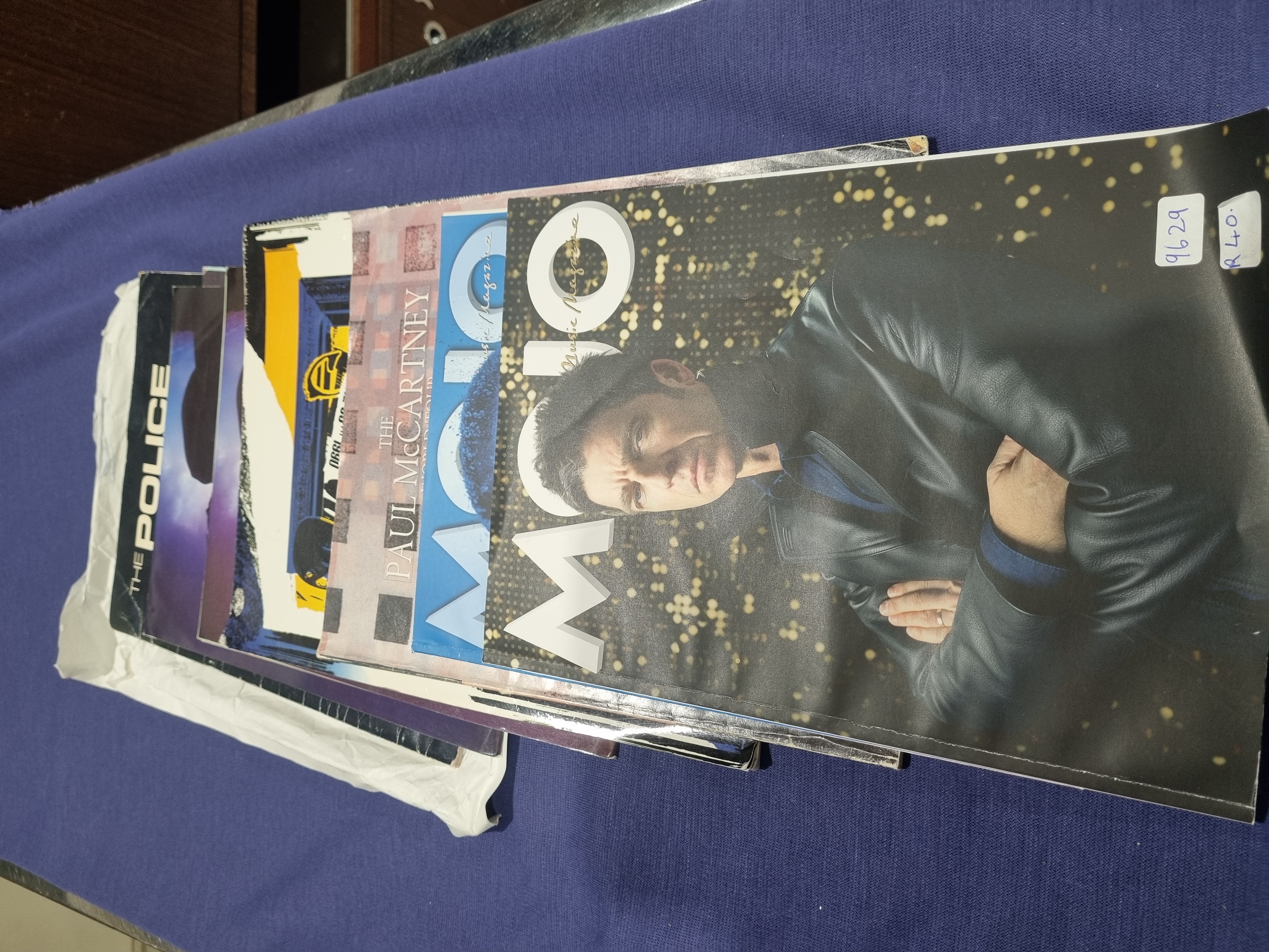 A collection of music-related softcover publications and tour programmes. The lot includes at least two issues of MOJO Music Magazine, one featuring a cover portrait of Paul McCartney in a black leather jacket with a white sans-serif masthead. Also present is a tour book titled The Paul McCartney World Tour, featuring a multi-coloured patterned cover design. The collection further contains a publication for The Police, bound in dark covers with white capitalised lettering along the left edge. Additional softcover music-related periodicals are included within the stack. Two adhesive labels are present on the upper right corner of the top magazine, marked with the characters 9629 and R 40.