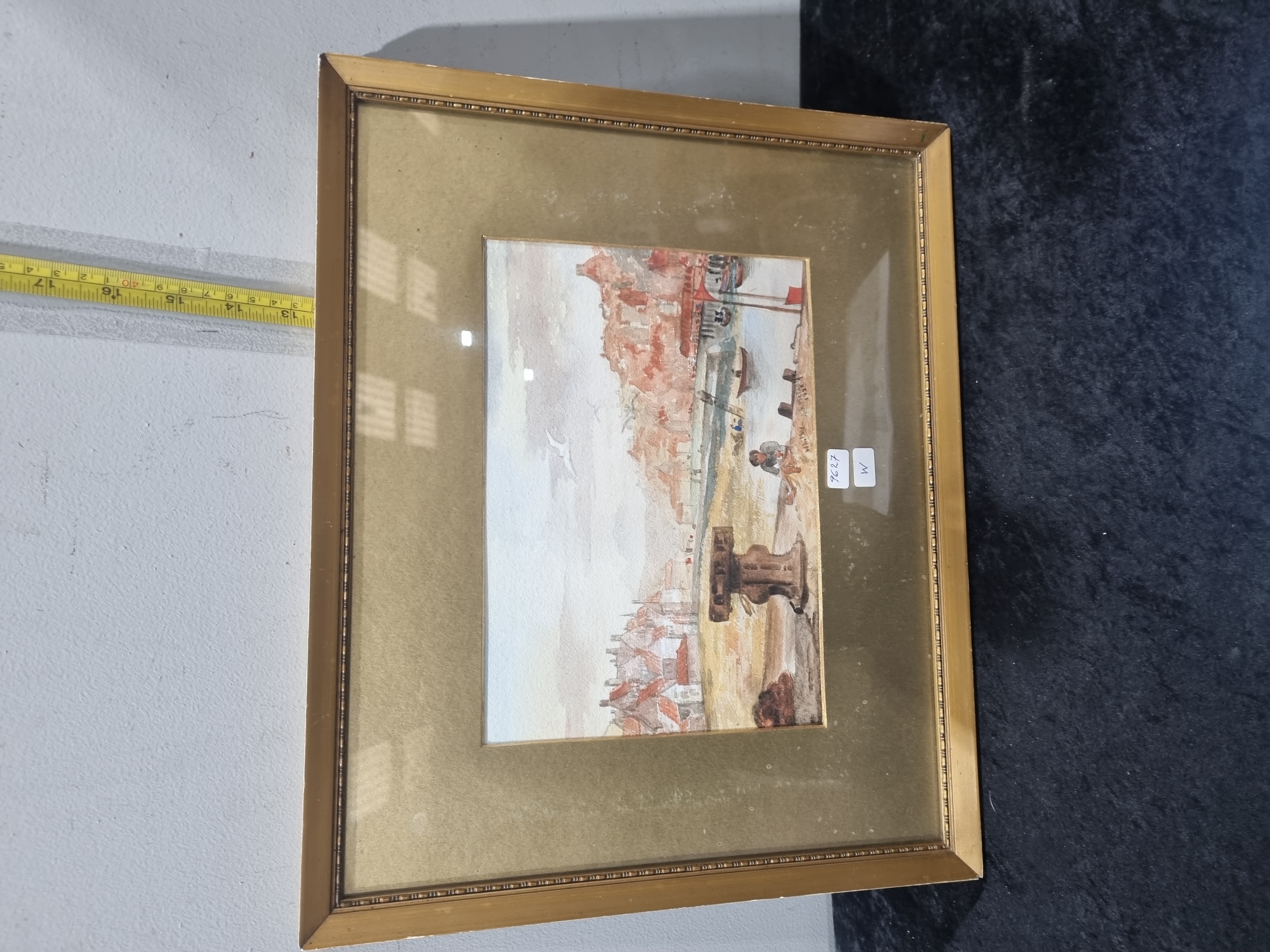 A topographical watercolour on paper by Hubert Williams depicting a view of Whitby harbour, North Yorkshire. The composition features a large wooden capstan situated on the quay in the foreground, with the town’s characteristic red-roofed buildings rising up the cliffside in the background. The work is executed in a loose, impressionistic style. The piece is signed Hubert Williams and inscribed Whitby 1928 along the right-hand edge. It is housed in a glazed gilt wood frame featuring a beaded inner border.