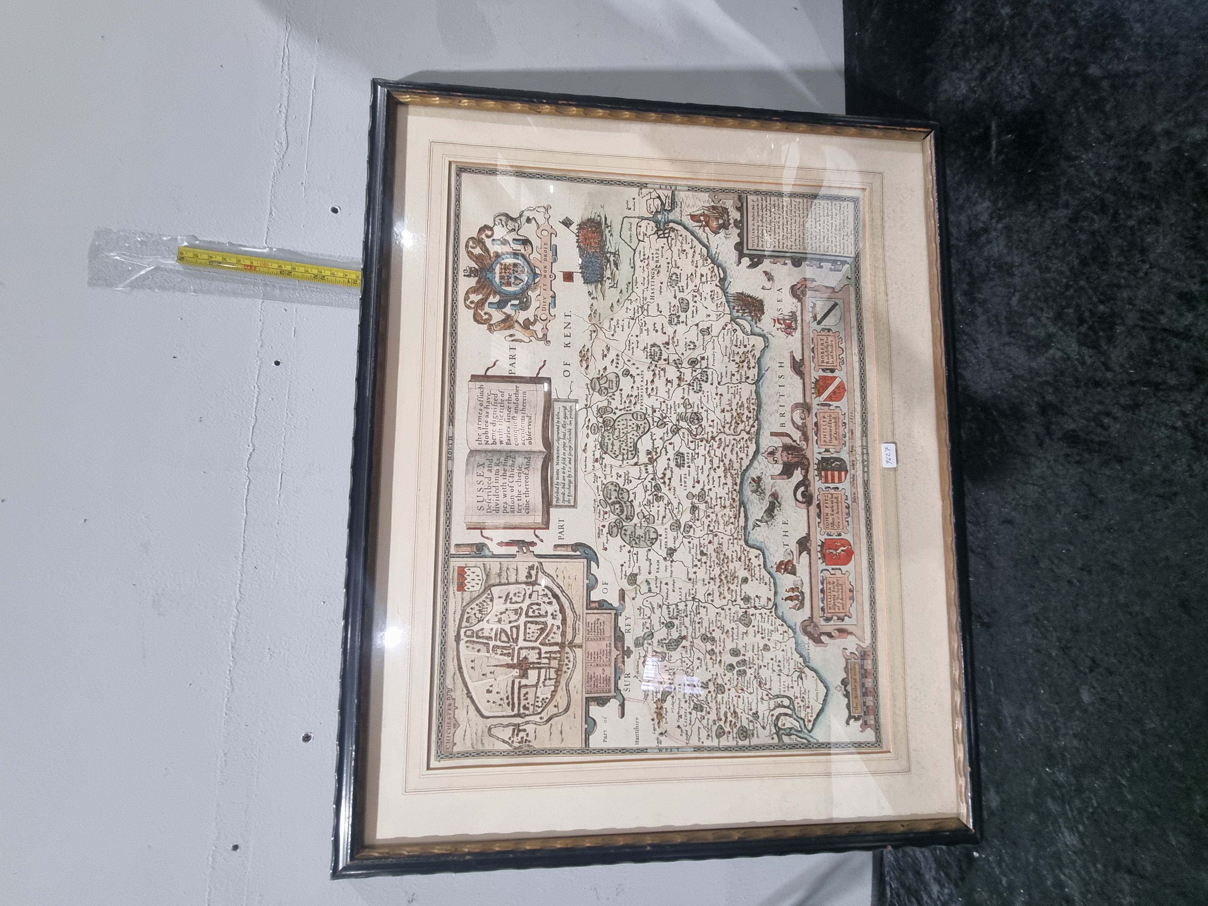 A hand-coloured engraved map of the county of Sussex by the cartographer John Speed. The title cartouche, designed as an open book, is inscribed Sussex Described and divided into Rapes with the situation of Chichester the cheife citie thereof. A publication line in a separate cartouche states Performed by John Speed and are to be sold in pops-head alley against the Exchange by John Sudbury and George Humble, with the date 1610. The map features an inset town plan of Chichester in the lower-left corner and the Royal Arms at the top left. A vertical column of eight heraldic shields representing the Earls of Sussex is positioned along the right-hand margin. The cartography shows the county divided into its historical administrative rapes and identifies significant towns, villages, and enclosed parks. The sea is decorated with engraved ships and sea monsters. The map is housed in a stepped black wooden frame with a gilt inner slip and a cream-coloured mount.