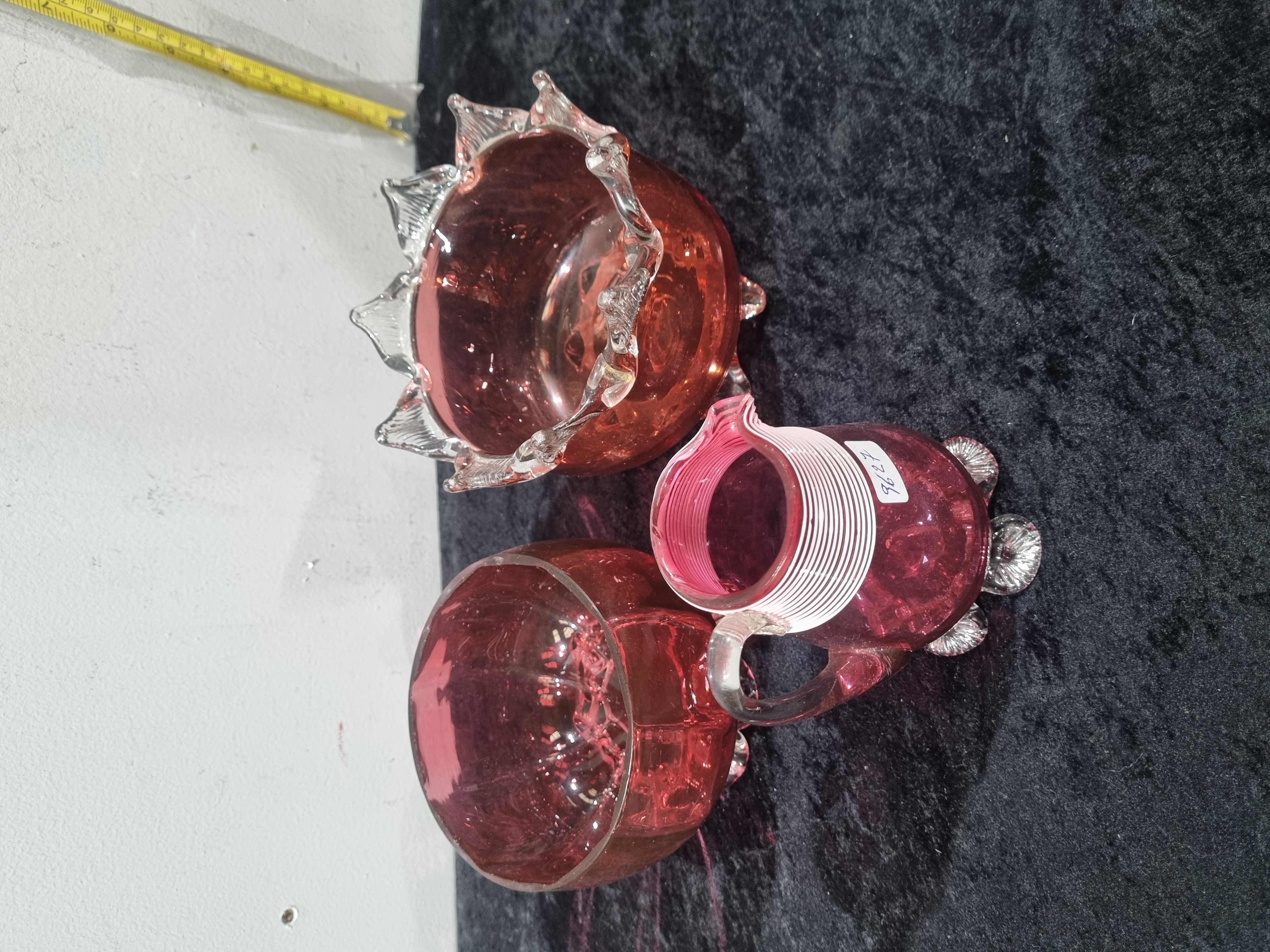 Three Victorian Cranberry Glass Decorative Items including a Threaded Jug and Rigaree Bowl