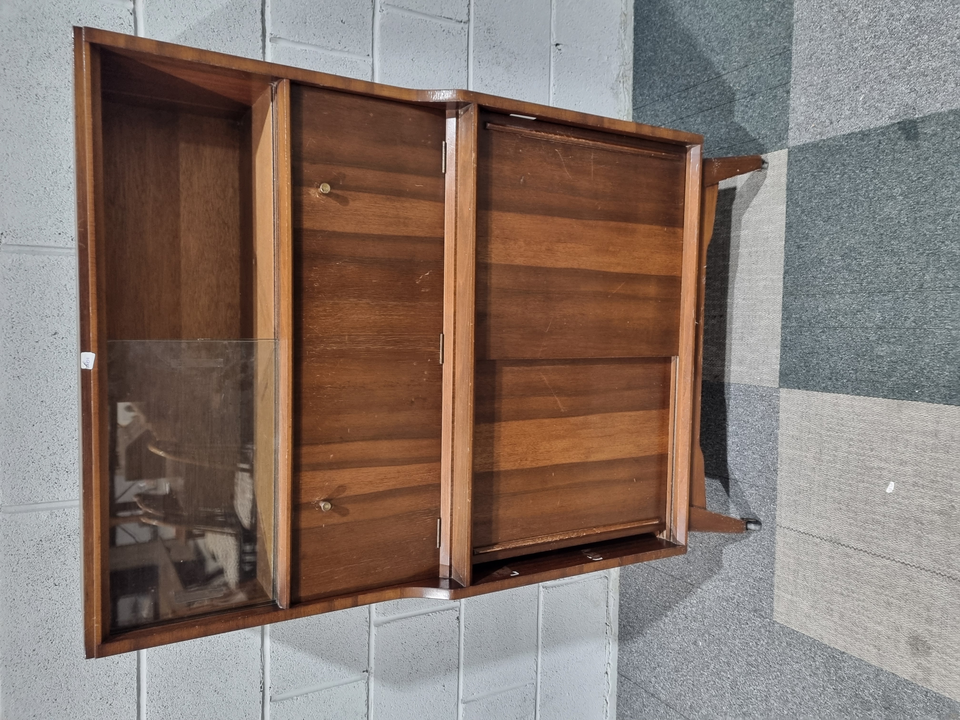 A mid-century modern teak veneer highboard bureau unit of rectilinear form, dating to the circa 1960s. The cabinet features a tripartite front arrangement. The left-hand section serves as a display area with sliding glass doors. The central section consists of a fall-front door opening to a fitted interior with various pigeonholes and a small internal drawer featuring a red pull. The right-hand section contains a cupboard with a sliding wooden door. The piece is supported by four tapered, out-swept legs. Hardware includes small, circular metal pulls. No maker’s marks or labels are present.