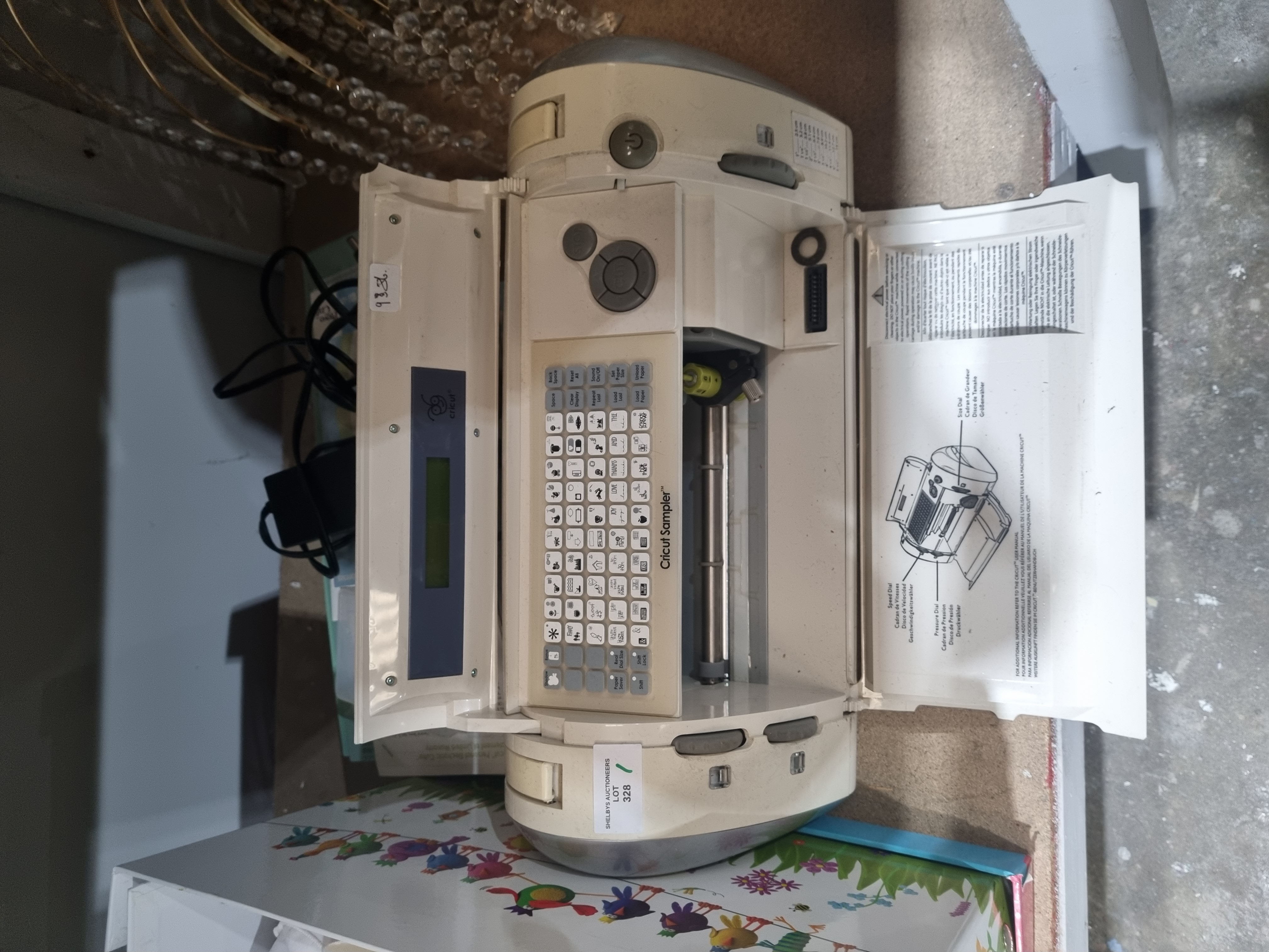 A Cricut Personal Electronic Cutter, model CRV001, constructed with a cream-coloured plastic housing. The machine features an integrated keypad for design selection, a small LCD screen, and a top-loading cartridge slot containing a Cricut Sampler cartridge. The interior lid displays a printed user guide diagram. The unit is accompanied by an external power adapter and lead.