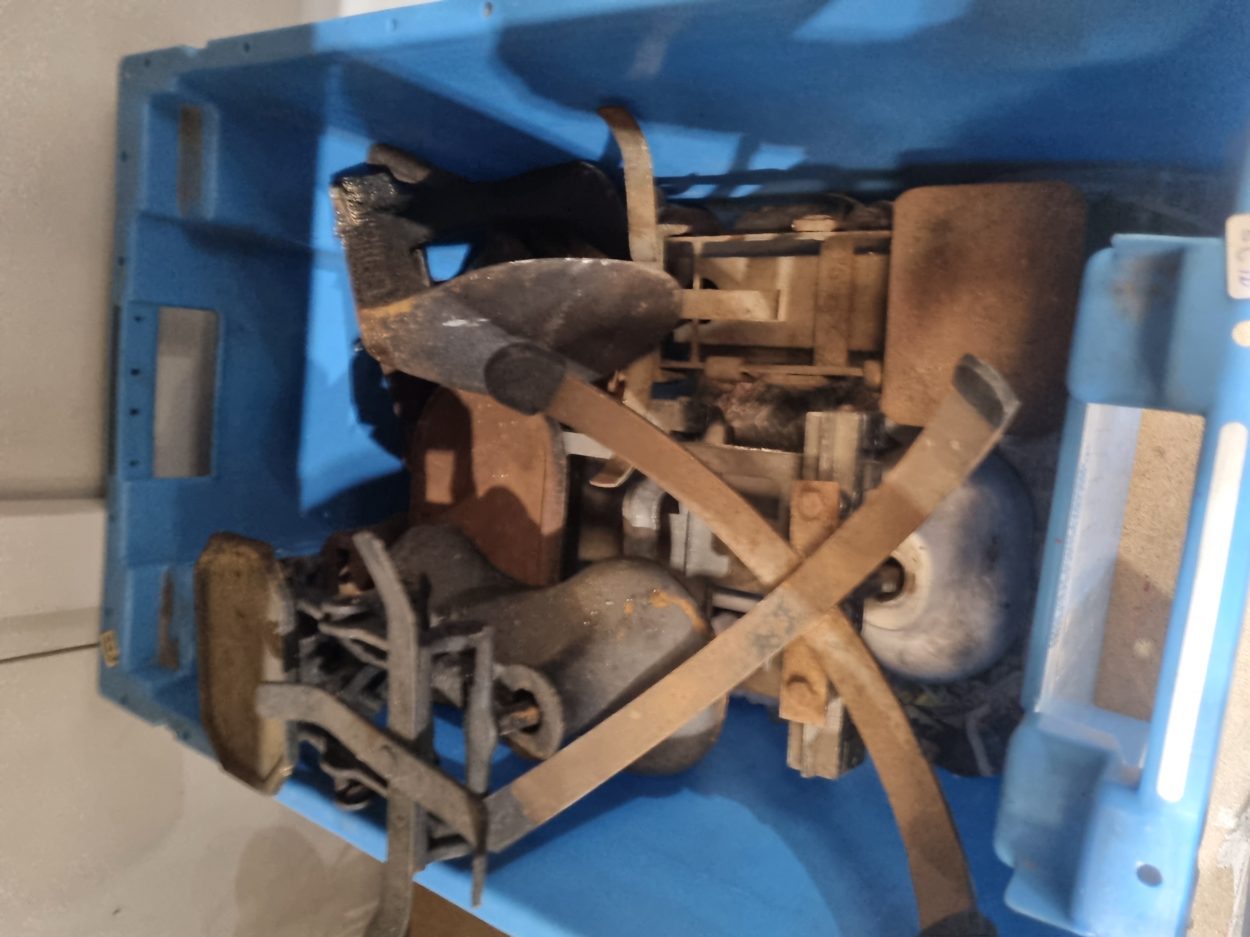 A collection of vintage shoemaker’s tools and equipment used in the cobbling trade. The lot comprises a tripod iron last with three feet and multiple individual foot-shaped forms of various sizes. The items are constructed from cast iron, with some elements showing evidence of leather or composite components. The design is typical of late 19th to mid-20th-century industrial equipment. No maker’s marks or inscriptions are identifiable due to the surface condition.