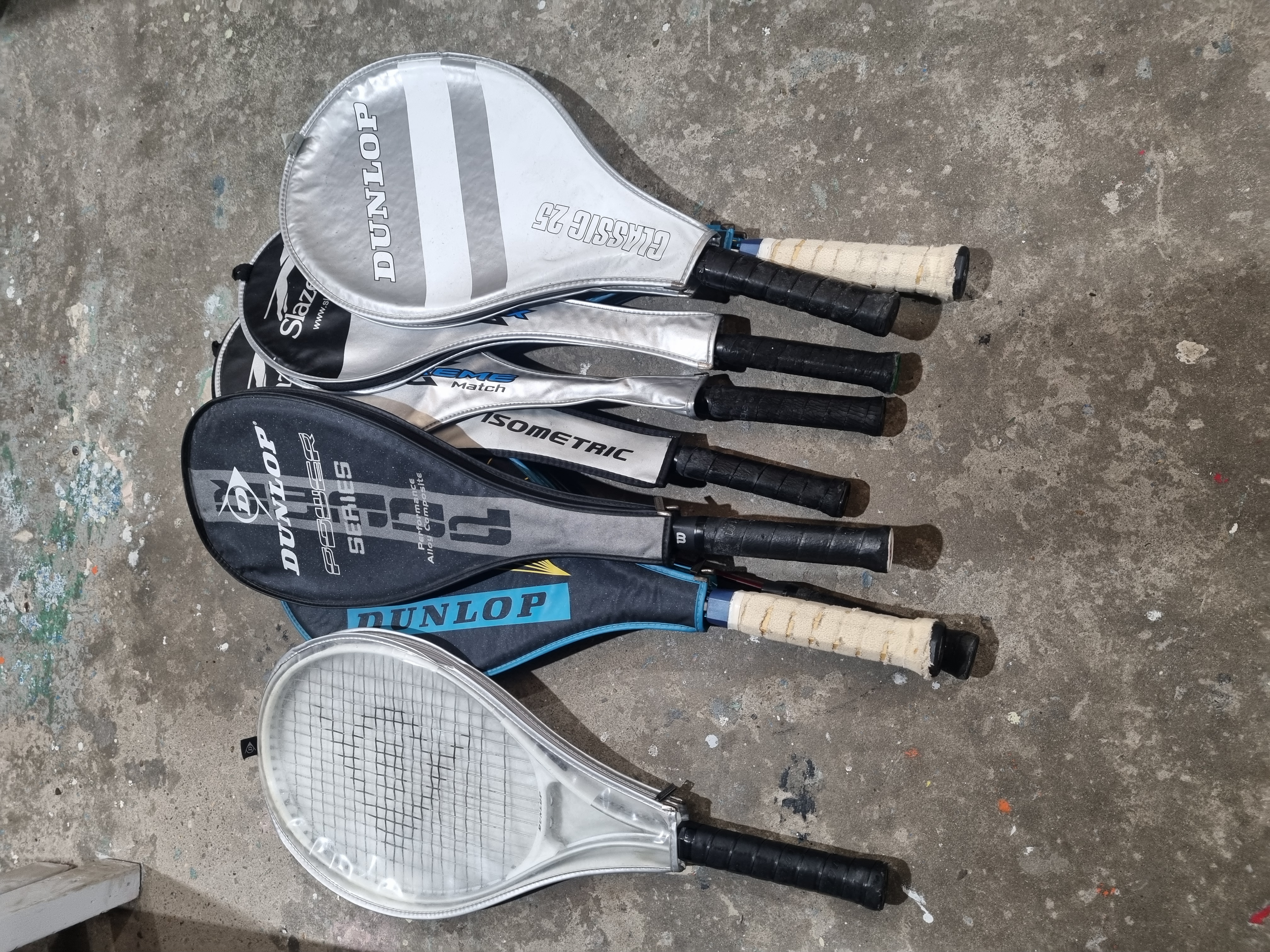 A collection of tennis racquets featuring various manufacturers and models, predominantly from the Dunlop brand. The group includes a Dunlop Classic 25 contained within a silver zip-up head cover and a Dunlop Power Series P55 Performance Alloy Composite racquet in a black and grey cover. Other head covers present bear the markings for Slazenger, Isometric, and Extreme Match. The racquets feature tape-wrapped handles in black and white. One racquet is partially visible without its cover, displaying a white-finished frame and dark-coloured strings. The items are constructed from materials including aluminium and alloy composites as indicated by the frame markings and cover branding.