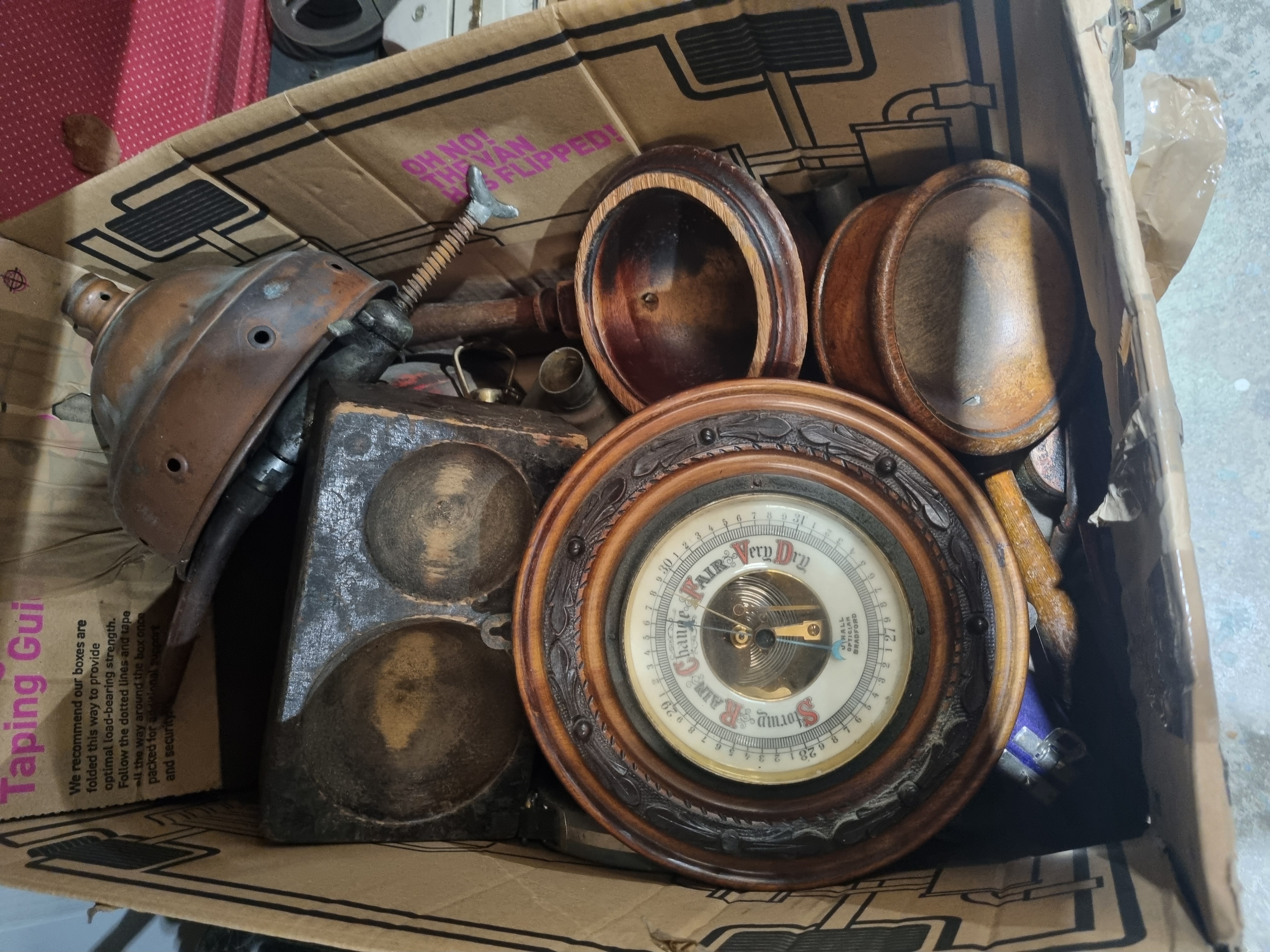 An aneroid barometer by J. Hall, Optician, Bradford, featuring a circular carved oak frame with a dark finish and foliate scroll motifs. The white dial is marked with weather indications including Stormy, Rain, Change, Fair, and Very Dry, alongside a numerical pressure scale. A central aperture reveals the internal brass aneroid mechanism. The dial is fitted with a black indicator hand and a brass-toned manual set-hand. This item is offered as part of an assortment of miscellaneous components, including additional circular wooden mounts and various metal hardware.
