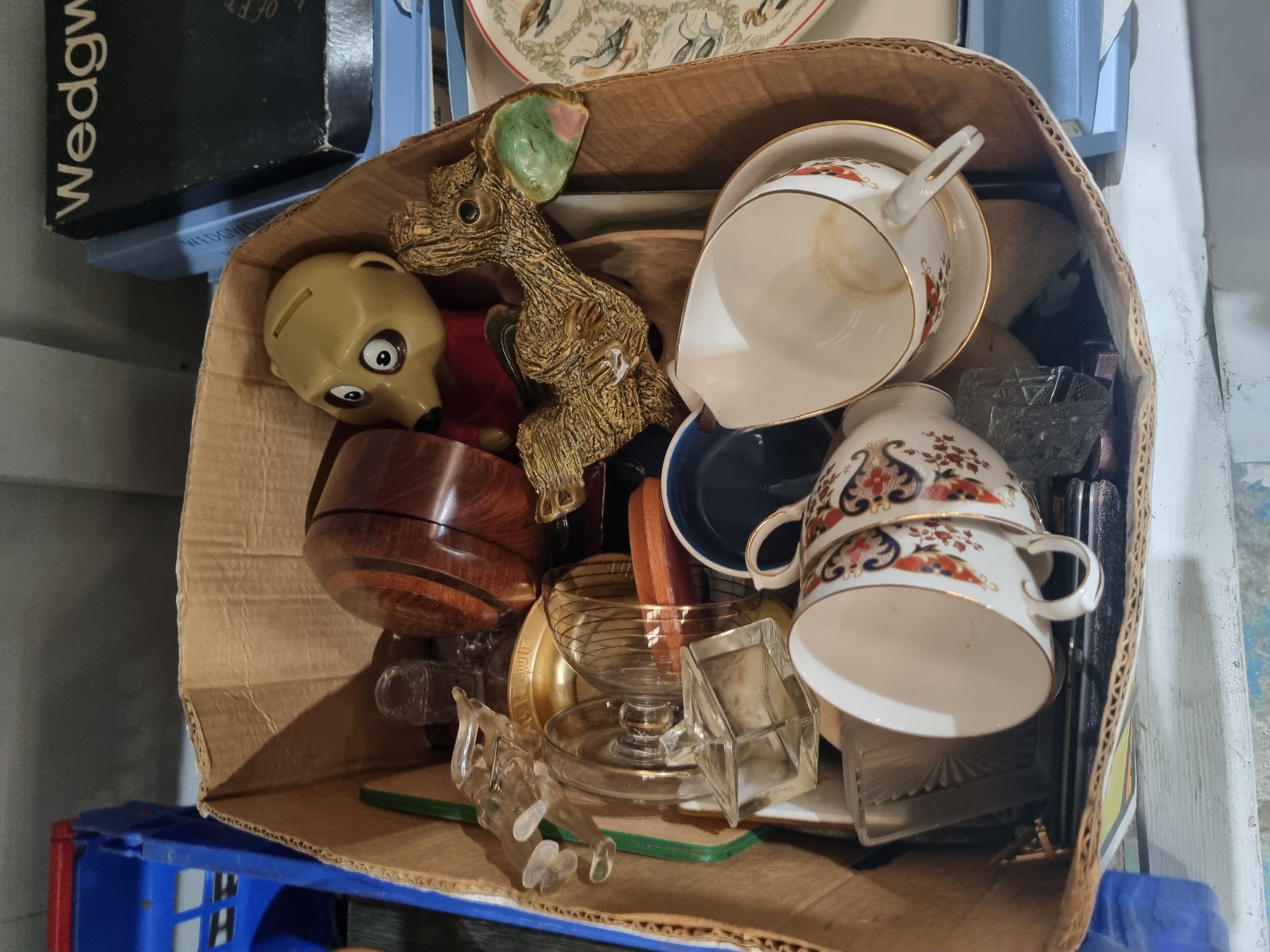 A collection of various decorative arts and household items. The ceramics include a pair of two-handled cups decorated in an Imari-style palette of iron red, cobalt blue, and gilt, alongside a white porcelain creamer with a gilt-rimmed edge. The lot features a large textured ceramic figure of a stylised creature with green-lined ears. Glassware consists of a clear pressed glass inkwell with a geometric design, a clear glass pedestal bowl with horizontal gilt banding, and a small clear glass animal figurine. Additional items include a turned wooden bowl with a polished finish, a plastic character-themed novelty bank, and a black box bearing the Wedgwood brand name.