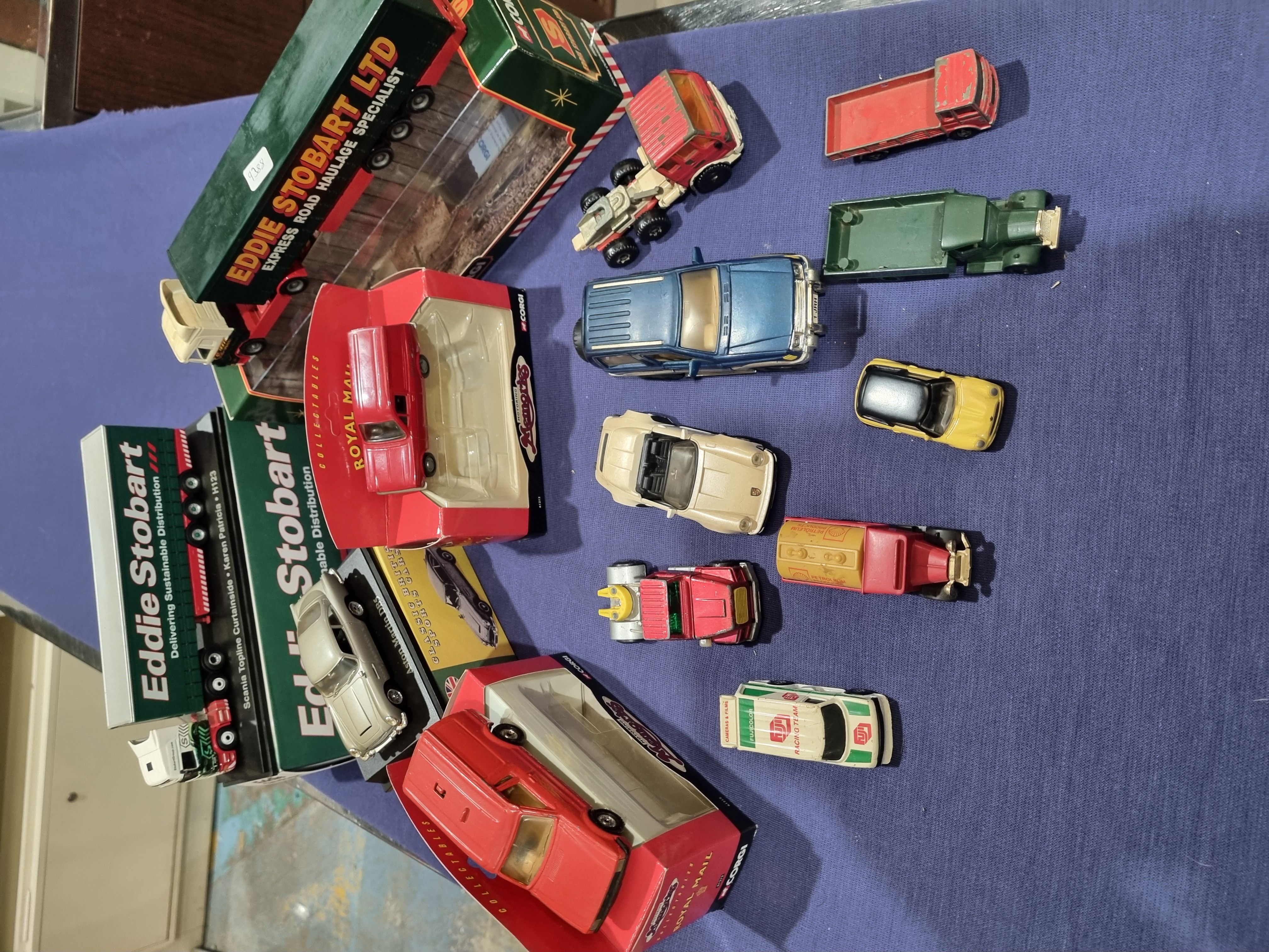 This collection consists of fourteen die-cast model vehicles, featuring a selection of boxed Corgi models alongside various loose items. The boxed items are identified by Corgi branding and include an Eddie Stobart Ltd Express Road Haulage Specialist articulated lorry, a Scania Topline Curtainside Karen Patricia H123 articulated lorry in Eddie Stobart livery, two Motoring Memories series Royal Mail delivery vans in red, and a Classic British Sports Cars series Aston Martin DB5 finished in silver-grey. The loose components of the collection include a blue Tesla, a cream-coloured convertible sports car, a white van with green and red Racing Team livery, a small yellow hatchback, a red and yellow vintage-style petrol tanker, a red articulated truck cab, a red flatbed lorry, a green vintage-style flatbed truck, and a small red tow truck. Each model is constructed from die-cast metal with plastic components and features standard free-rolling wheels.
