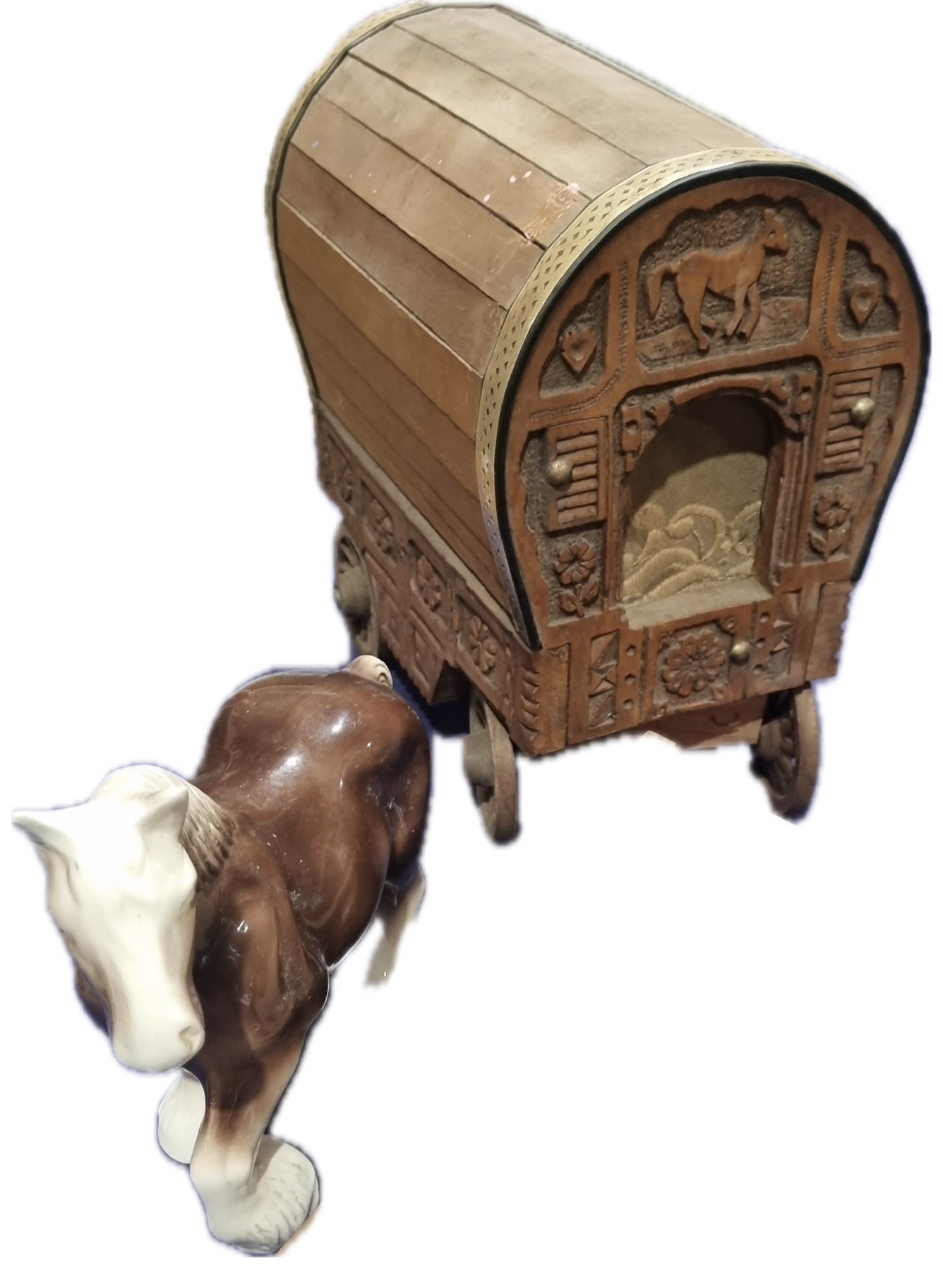 This lot consists of two decorative items: a glazed ceramic figure of a heavy horse and a hand-crafted wooden model of a Romani bow-top vardo. The vardo features extensive chip-carved decoration across the front and side panels, including floral motifs, heart shapes, and a relief carving of a horse situated above the arched doorway. The interior is visible through the entrance and is lined with a padded, quilted fabric. The roof is constructed from individual wooden slats, and the model is set upon four wooden wheels. The ceramic horse, depicted in a walking pose, is finished in a bay glaze with white markings on the face and lower legs. The figure is designed in the style of major British manufacturers such as Beswick or Royal Doulton, though no maker marks or signatures are present on either piece.