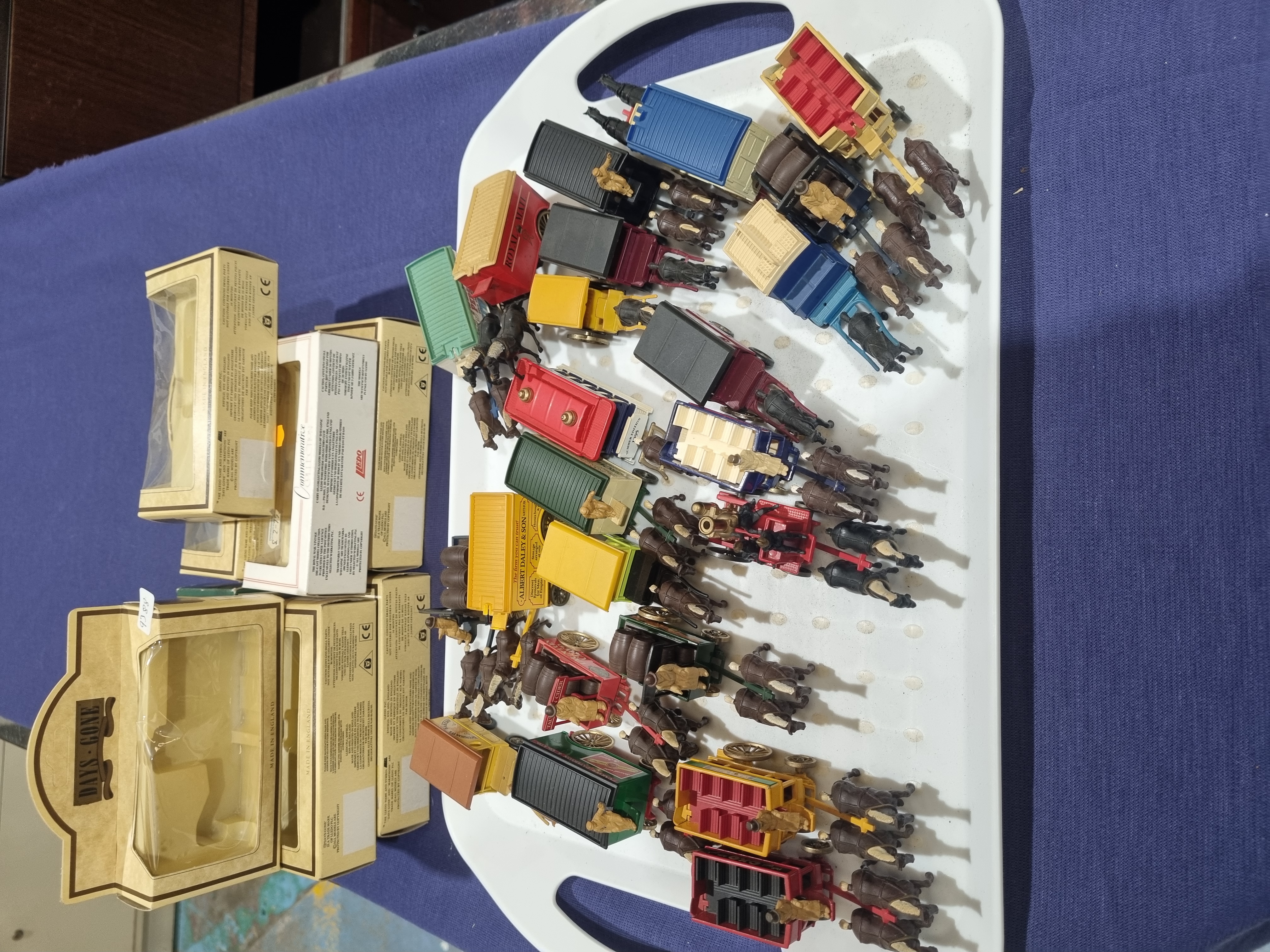 A collection of die-cast metal and plastic horse-drawn miniature vehicles from the Days Gone series by Lledo. The assortment includes various models such as omnibuses, delivery wagons, and carts. Visible liveries include Royal Mail and Albert Daley & Son. The vehicles feature die-cast bodies with plastic components for the horses, drivers, and wheels. Several models are accompanied by original cardboard window-style boxes, while the majority are loose. The boxes are marked Made in England.