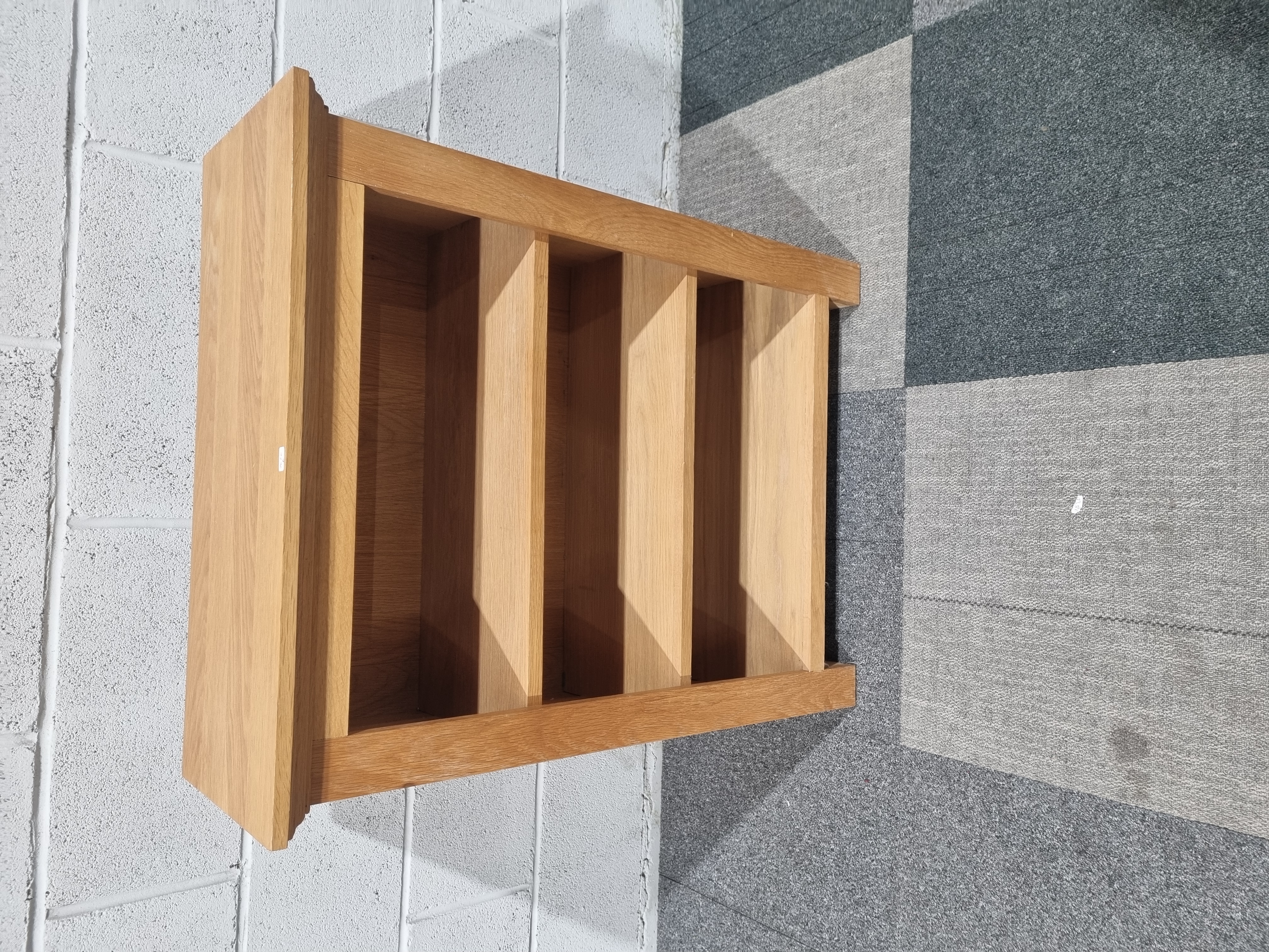 A contemporary light oak media or storage rack of single-piece construction. The unit features a rectangular frame with a moulded top and base. The interior contains three fixed vertical dividers, creating four equal storage compartments suitable for CDs or small books. The design is open-fronted with no glazing or adjustable shelving. A small, illegible white rectangular adhesive label is present on the left-hand side panel.