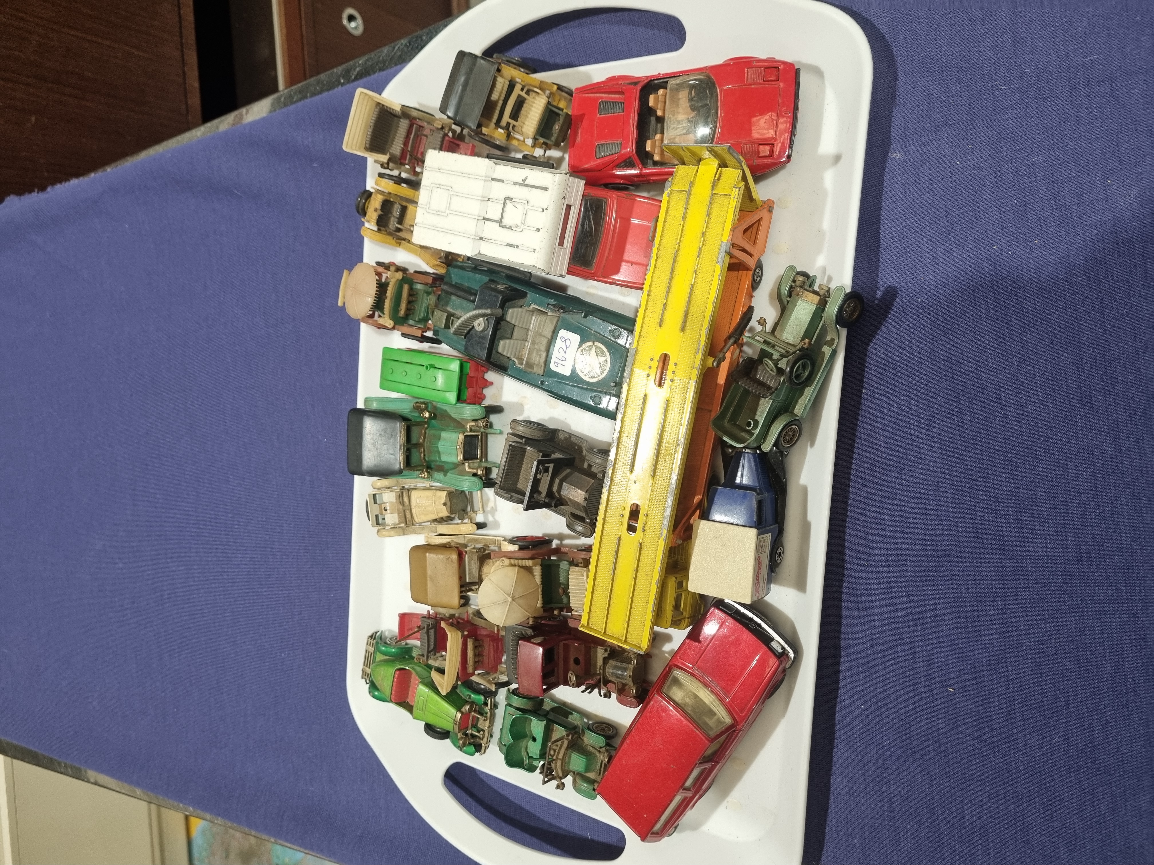 A collection of loose die-cast toy vehicles featuring a variety of types and scales. The assortment includes a car transporter with a manually adjustable upper deck, several vintage-style veteran and commercial vehicles, sports cars, and a military-style vehicle. One blue delivery truck bears the Kellogg’s brand name in red cursive script on the side. A green military vehicle features a white star insignia within a circle on the bonnet. The vehicles are constructed from die-cast metal with plastic components such as wheels, glazing, and interior details. The models are consistent with those produced by manufacturers such as Lesney Matchbox and Corgi. One vehicle carries a white adhesive sticker with the handwritten digits 4623.