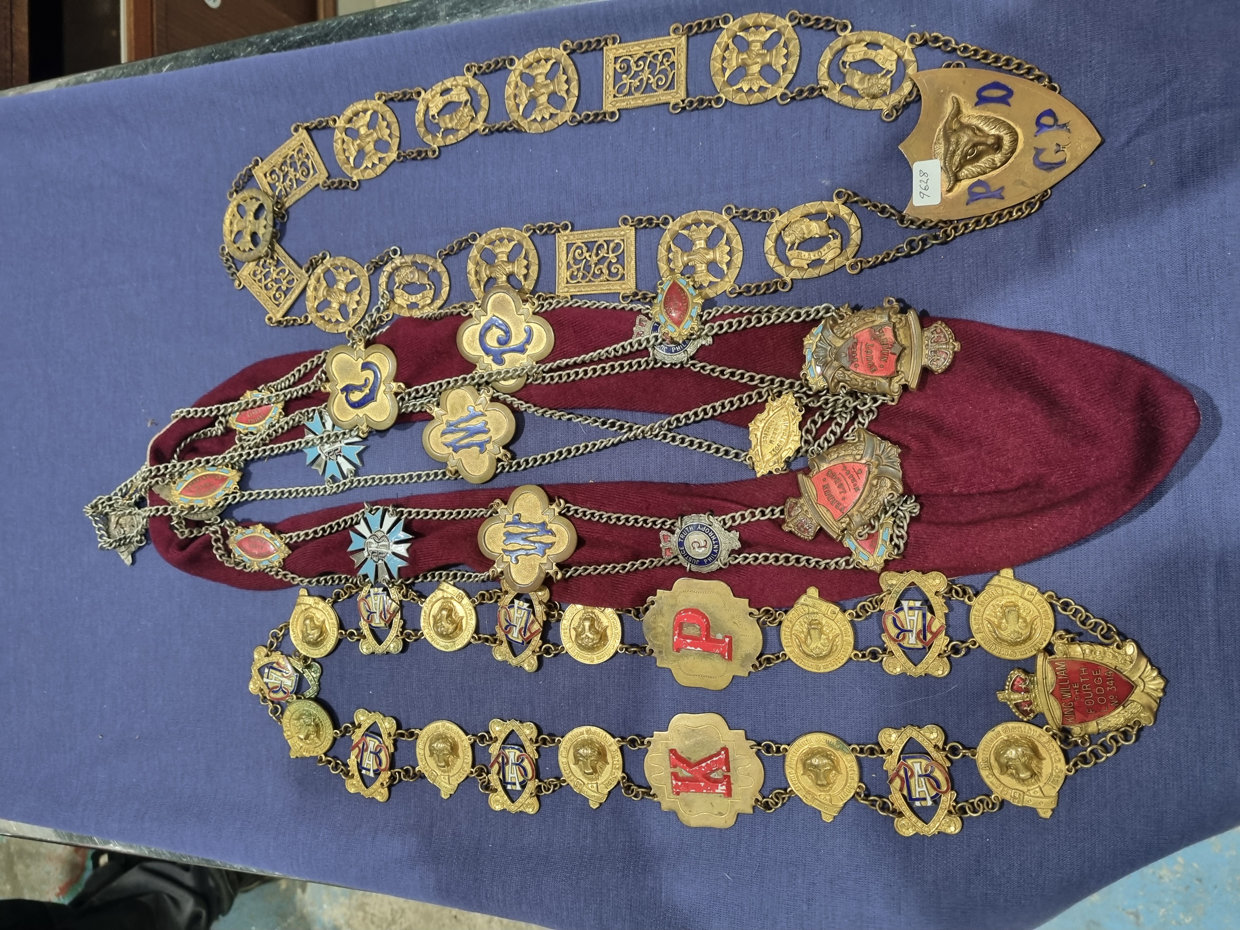 This lot comprises a collection of fraternal regalia associated with the Royal Antediluvian Order of Buffaloes (RAOB). The assembly includes two gilt metal and enamelled chains of office and various associated lodge jewels presented on a maroon textile backing. The upper chain is constructed from openwork circular and rectangular links featuring animal and scroll motifs, terminating in a shield-shaped pendant with a central relief of a stag’s head and the blue-enamelled letters PG. The lower chain consists of medallions depicting buffalo heads alternating with enamelled plaques, including a red-enamelled shield jewel inscribed King William the Fourth Lodge No 3414. The collection further includes various star and heart-shaped medals with enamelled decorations, some bearing the order’s motto Justice Philanthropy Truth and the initials R.A.O.B. Additional enamelled monograms present on the jewels include CP and MW. The items are constructed from gilt base metal with polychrome enamel accents.